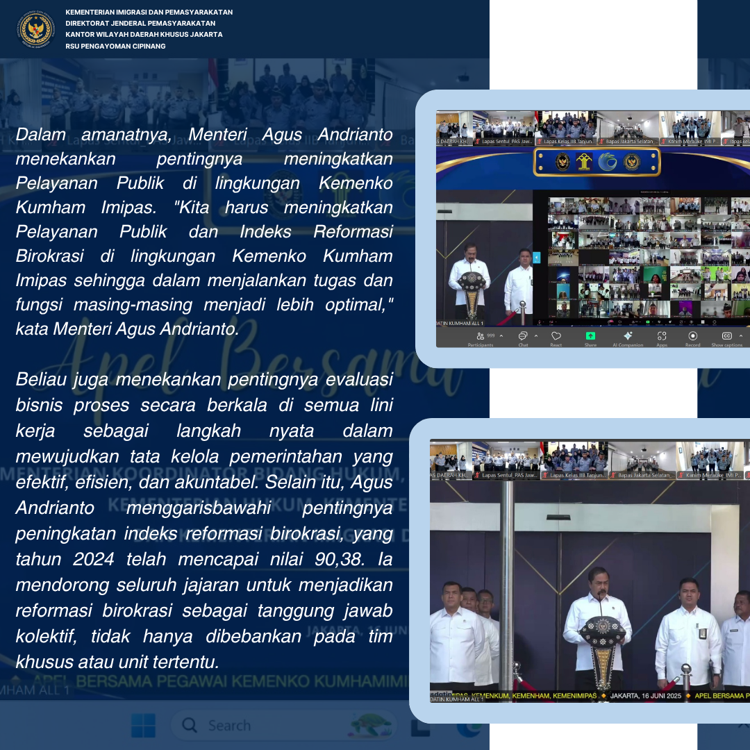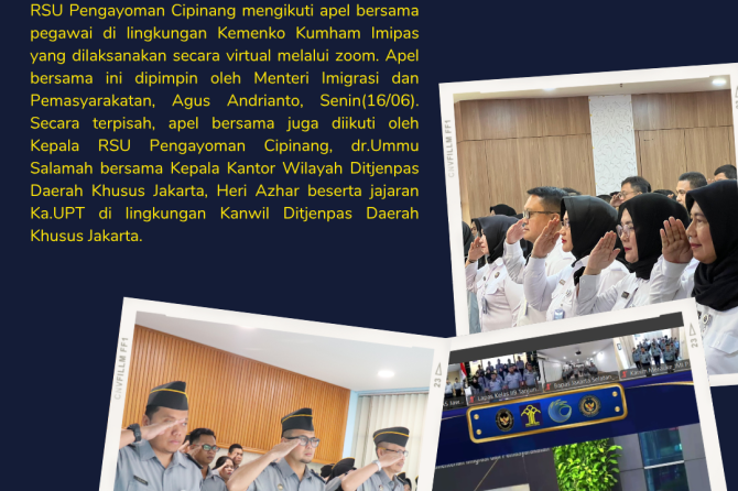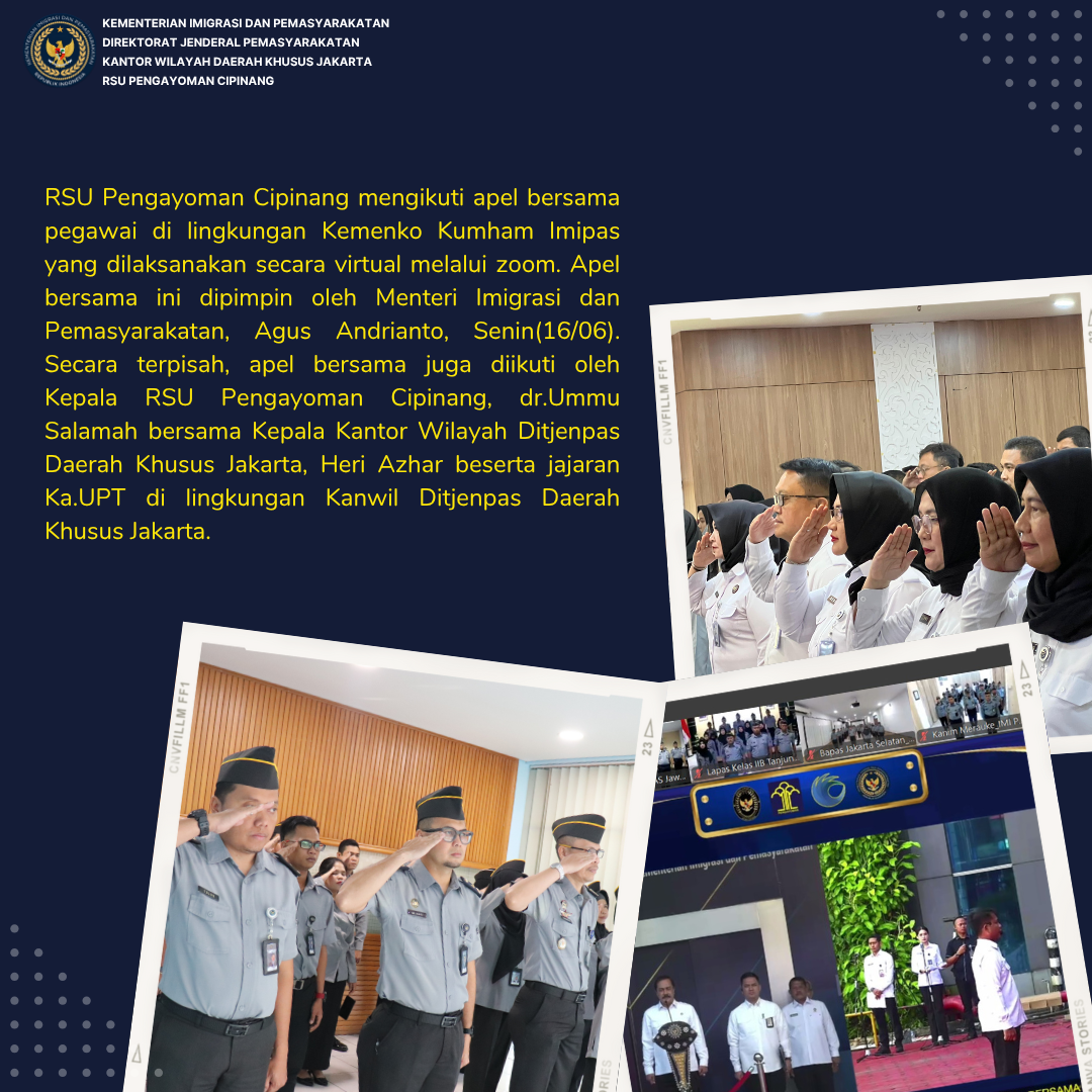 RSU Pengayoman Cipinang mengikuti apel bersama pegawai di lingkungan Kemenko Kumham Imipas yang dilaksanakan secara virtual melalui zoom. Apel bersama ini dipimpin oleh Menteri Imigrasi dan Pemasyarakatan, Agus Andrianto, Senin(16/06). Secara terpisah, apel bersama juga diikuti oleh Kepala RSU Pengayoman Cipinang, dr.Ummu Salamah bersama Kepala Kantor Wilayah Ditjenpas Daerah Khusus Jakarta, Heri Azhar beserta jajaran Ka.UPT di lingkungan Kanwil Ditjenpas Daerah Khusus Jakarta.