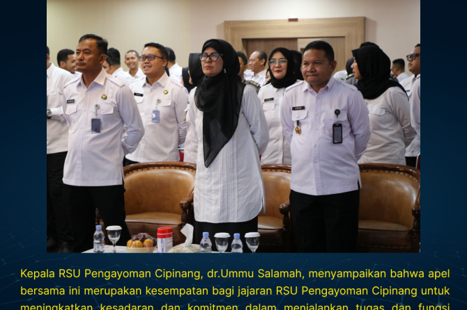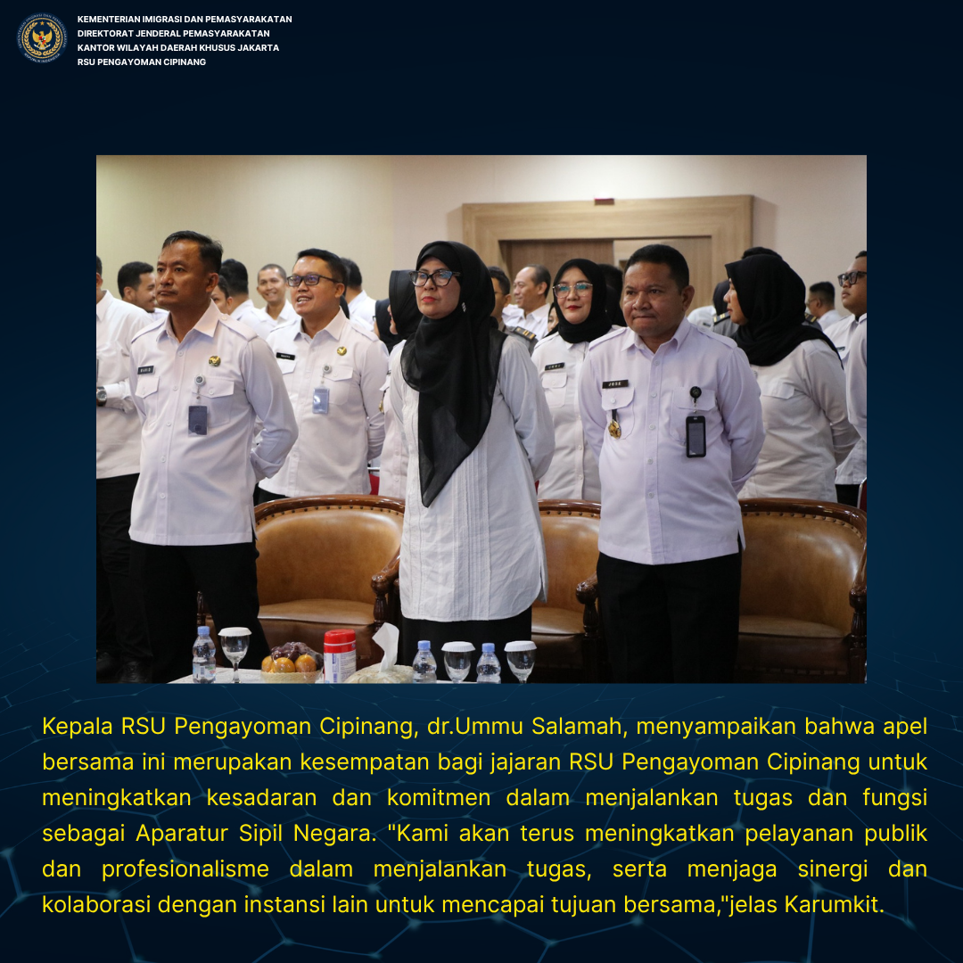 Kepala RSU Pengayoman Cipinang, dr.Ummu Salamah, menyampaikan bahwa apel bersama ini merupakan kesempatan bagi jajaran RSU Pengayoman Cipinang untuk meningkatkan kesadaran dan komitmen dalam menjalankan tugas dan fungsi sebagai Aparatur Sipil Negara. “Kami akan terus meningkatkan pelayanan publik dan profesionalisme dalam menjalankan tugas, serta menjaga sinergi dan kolaborasi dengan instansi lain untuk mencapai tujuan bersama,”jelas Karumkit.