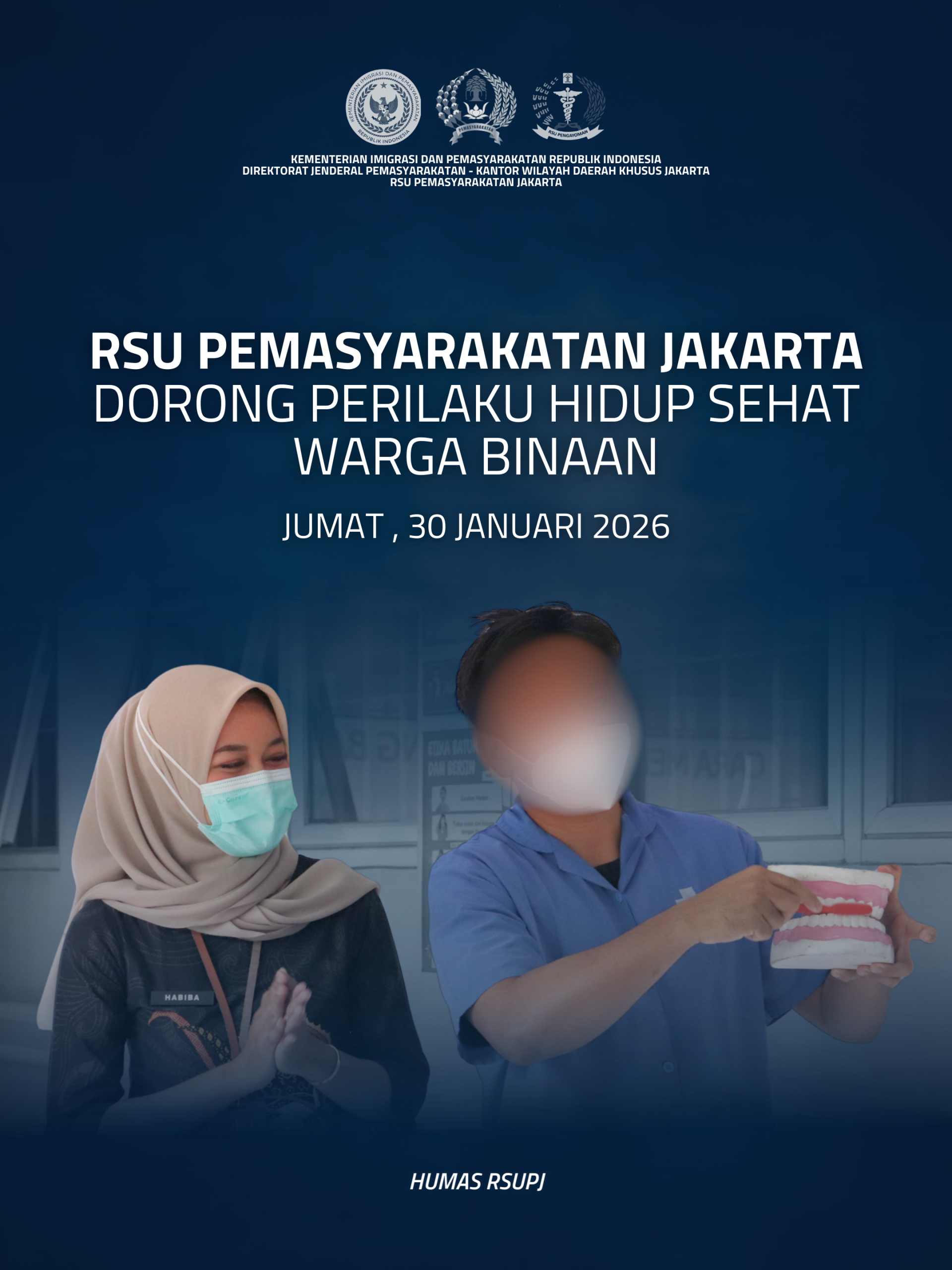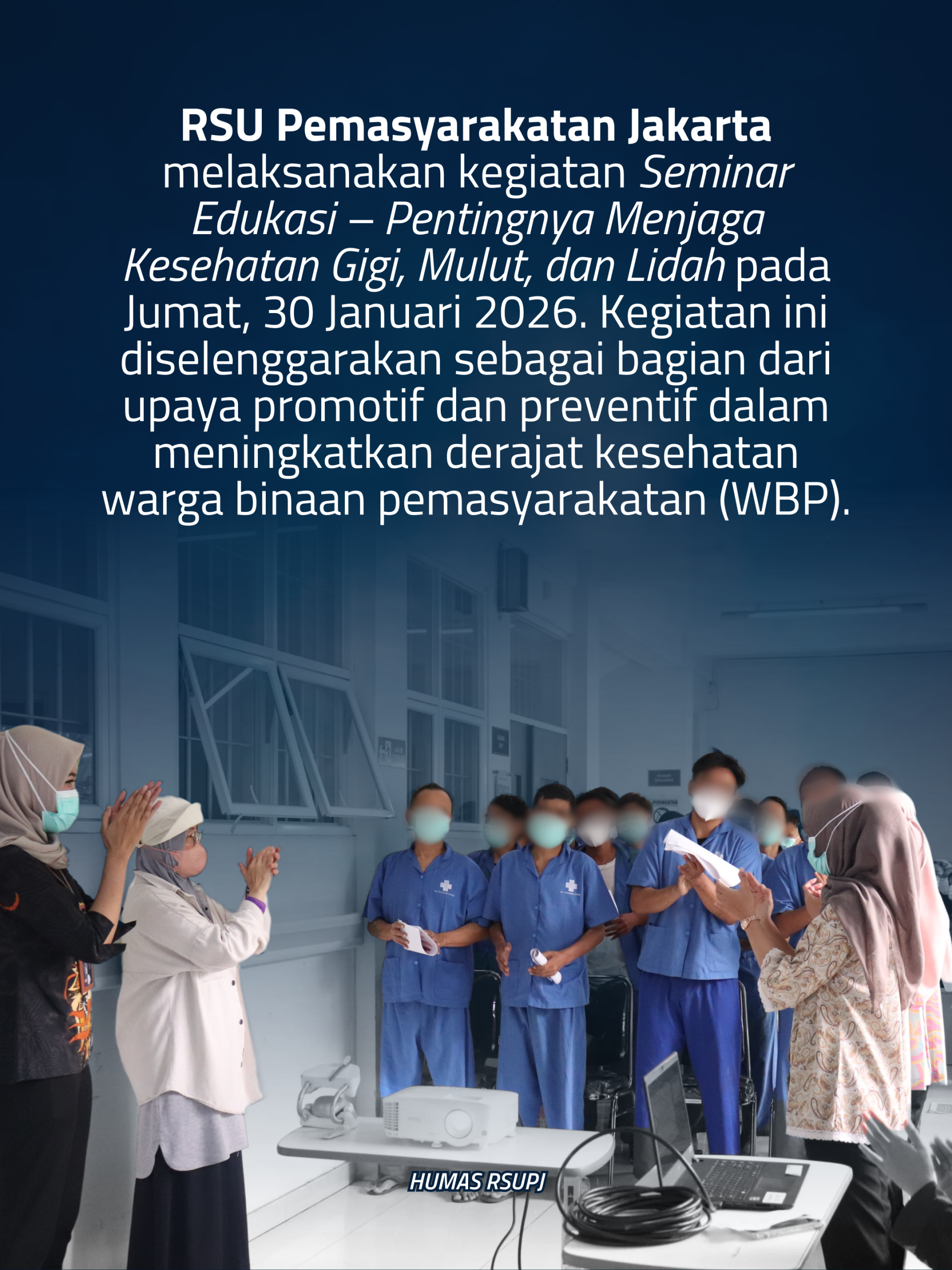 RSU Pemasyarakatan Jakarta melaksanakan kegiatan Seminar Edukasi – Pentingnya Menjaga Kesehatan Gigi, Mulut, dan Lidah pada Jumat, 30 Januari 2026. Kegiatan ini diselenggarakan sebagai bagian dari upaya promotif dan preventif dalam meningkatkan derajat kesehatan warga binaan pemasyarakatan (WBP).