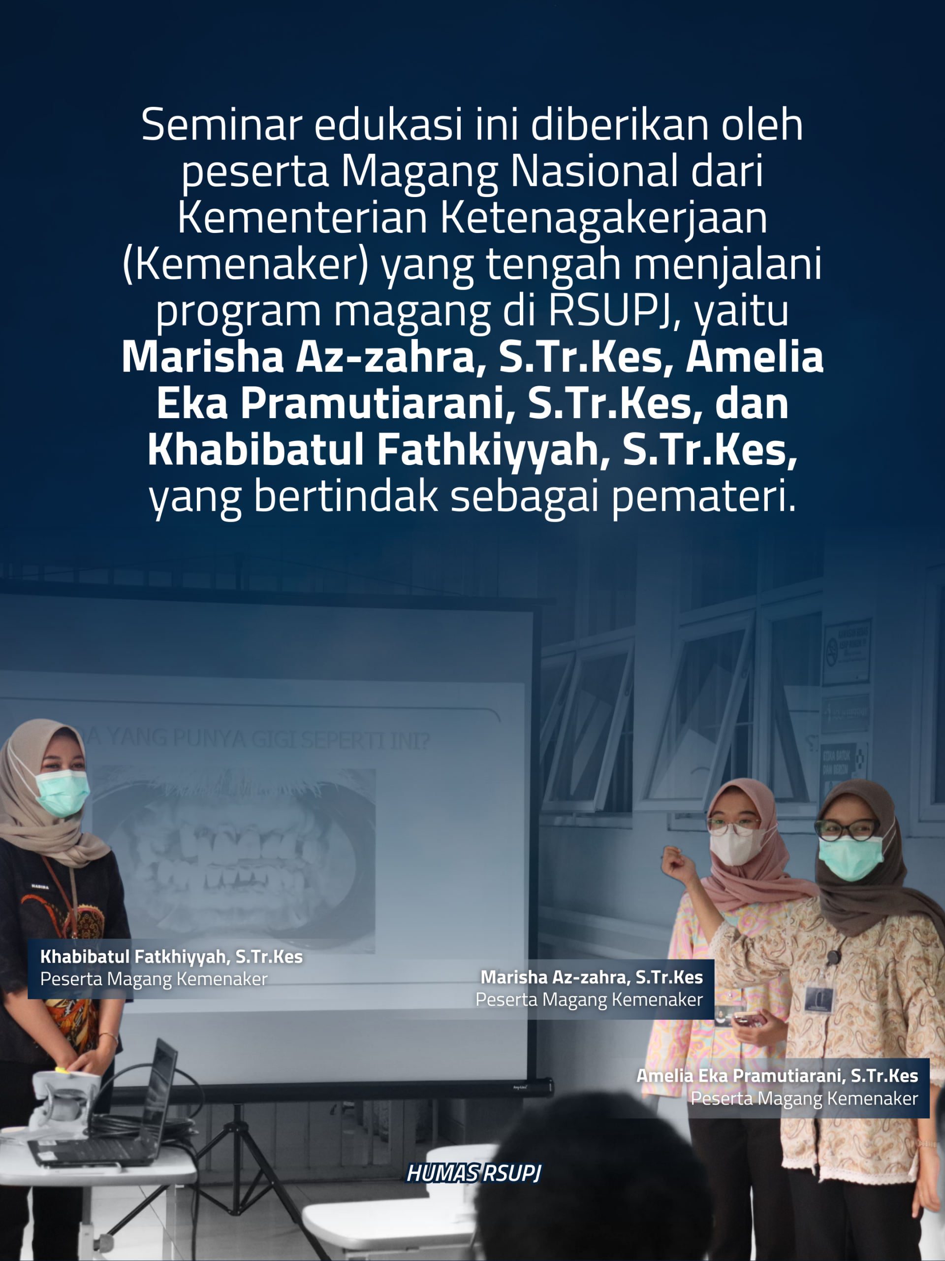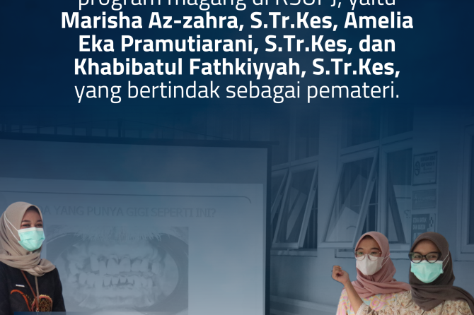 Seminar edukasi ini diberikan oleh peserta Magang Nasional dari Kementerian Ketenagakerjaan (Kemenaker) yang tengah menjalani program magang di RSUPJ, yaitu Marisha Az-zahra, S.Tr.Kes, Amelia Eka Pramutiarani, S.Tr.Kes, dan Khabibatul Fathkiyyah, S.Tr.Kes, yang bertindak sebagai pemateri.