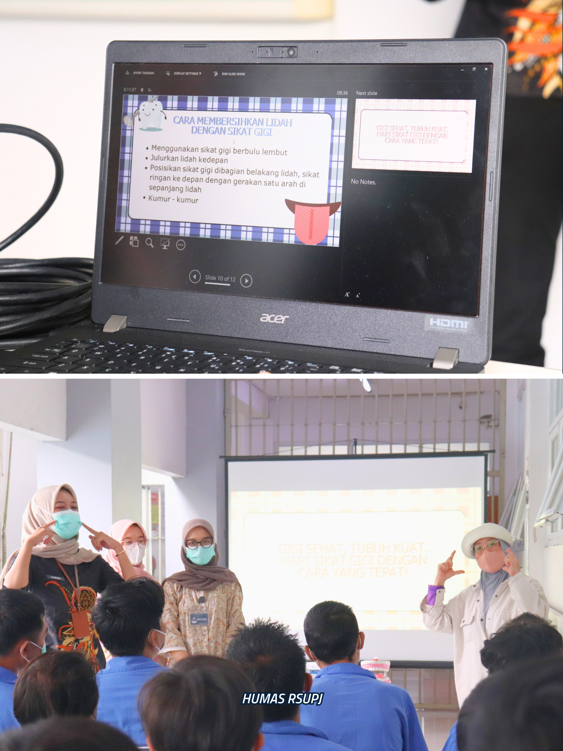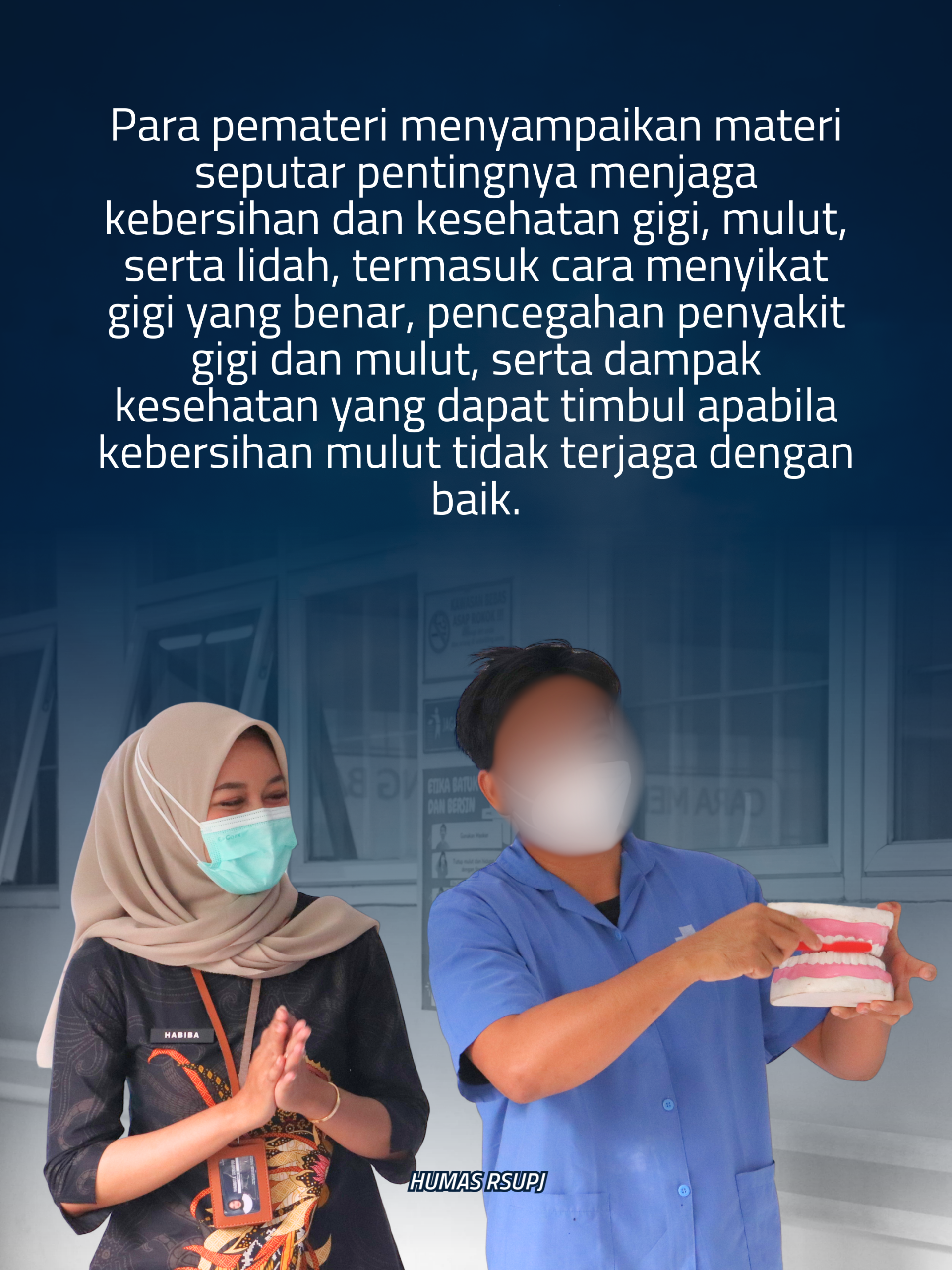Para pemateri menyampaikan materi seputar pentingnya menjaga kebersihan dan kesehatan gigi, mulut, serta lidah, termasuk cara menyikat gigi yang benar, pencegahan penyakit gigi dan mulut, serta dampak kesehatan yang dapat timbul apabila kebersihan mulut tidak terjaga dengan baik.