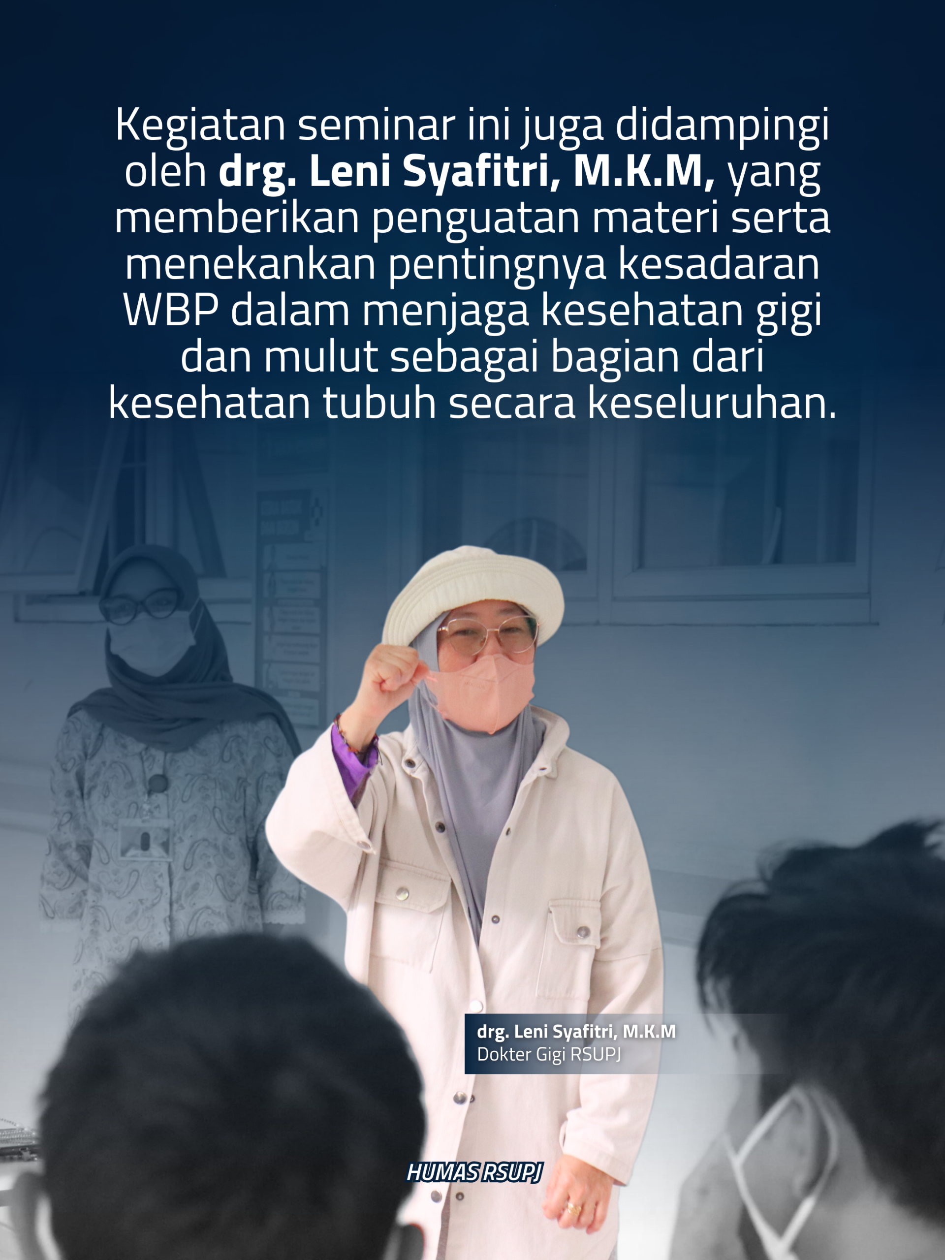 Kegiatan seminar ini juga didampingi oleh drg. Leni Syafitri, M.K.M, yang memberikan penguatan materi serta menekankan pentingnya kesadaran WBP dalam menjaga kesehatan gigi dan mulut sebagai bagian dari kesehatan tubuh secara keseluruhan.