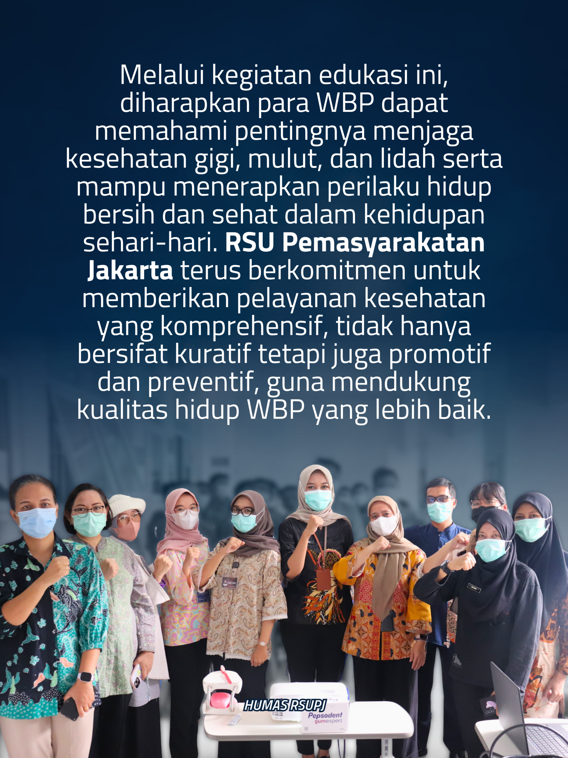 Melalui kegiatan edukasi ini, diharapkan para WBP dapat memahami pentingnya menjaga kesehatan gigi, mulut, dan lidah serta mampu menerapkan perilaku hidup bersih dan sehat dalam kehidupan sehari-hari. RSU Pemasyarakatan Jakarta terus berkomitmen untuk memberikan pelayanan kesehatan yang komprehensif, tidak hanya bersifat kuratif tetapi juga promotif dan preventif, guna mendukung kualitas hidup WBP yang lebih baik.