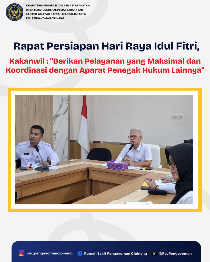 Menindaklanjuti arahan Kakanwil, Karumkit beserta jajaran berkomitmen dan siap menjalankan tugasnya mewujudkan perayaan Idul fitri di RSU Pengayoman Cipinang dengan mengoptimalkan pelayanan prima dan memastikan semua berjalan dengan lancar dan kondusif.