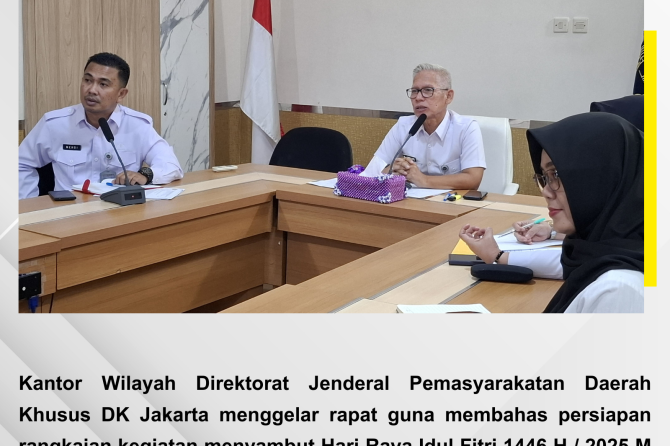 Kantor Wilayah Direktorat Jenderal Pemasyarakatan Daerah Khusus DK Jakarta menggelar rapat guna membahas persiapan rangkaian kegiatan menyambut Hari Raya Idul Fitri 1446 H / 2025 M secara virtual, Rabu(20/03). Rapat juga dihadiri oleh Kepala RSU Pengayoman Cipinang, dr.Ummu Salamah dan seluruh Kepala Unit Pelaksana Teknis (Ka.UPT) di lingkungan Kanwil Direktorat Jenderal Pemasyarakatan secara virtual.