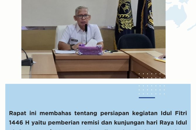 Rapat ini membahas tentang persiapan kegiatan Idul Fitri 1446 H yaitu pemberian remisi dan kunjungan hari Raya Idul Fitri 1446 H / 2025 M. Kakanwil, Heri Azhari mengatakan, “Meskipun kegiatan pelayanan kunjungan Idul Fitri berlangsung 2 hari, namun berikan pelayanan yang maksimal kepada masyarakat, serta lakukan koordinasi bantuan keamanan kepada TNI dan Polri”, tegasnya.