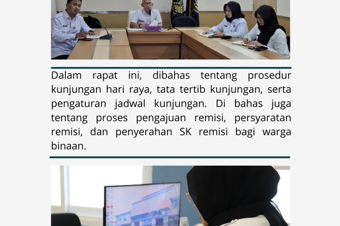 Dalam rapat ini, dibahas tentang prosedur kunjungan hari raya, tata tertib kunjungan, serta pengaturan jadwal kunjungan. Di bahas juga tentang proses pengajuan remisi, persyaratan remisi, dan penyerahan SK remisi bagi warga binaan.