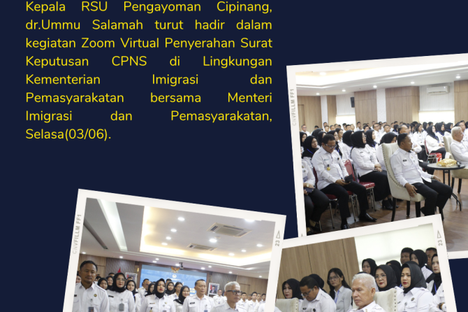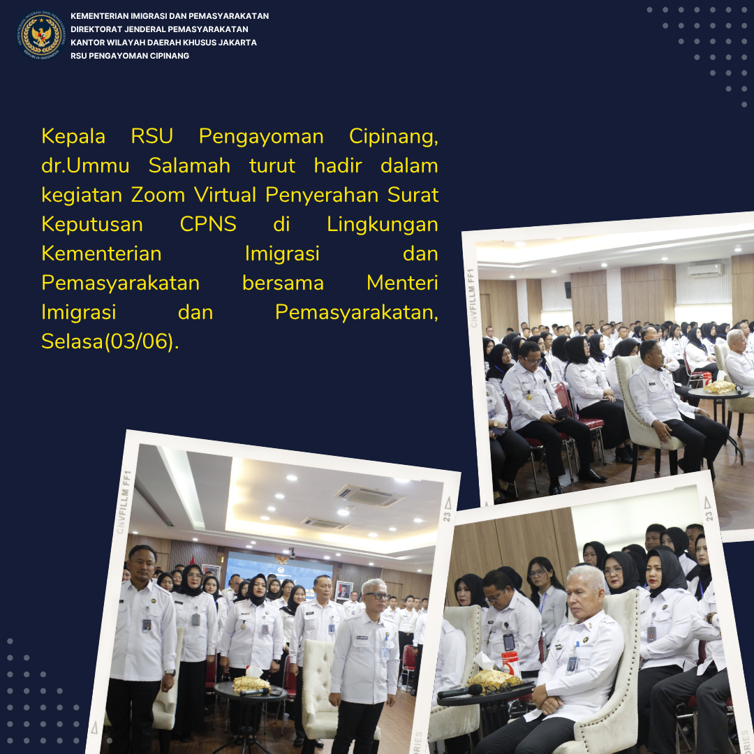 Kepala RSU Pengayoman Cipinang, dr.Ummu Salamah turut hadir dalam kegiatan Zoom Virtual Penyerahan Surat Keputusan CPNS di Lingkungan Kementerian Imigrasi dan Pemasyarakatan bersama Menteri Imigrasi dan Pemasyarakatan, Selasa(03/06).