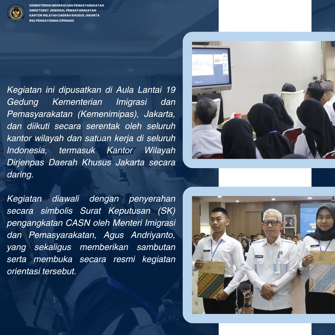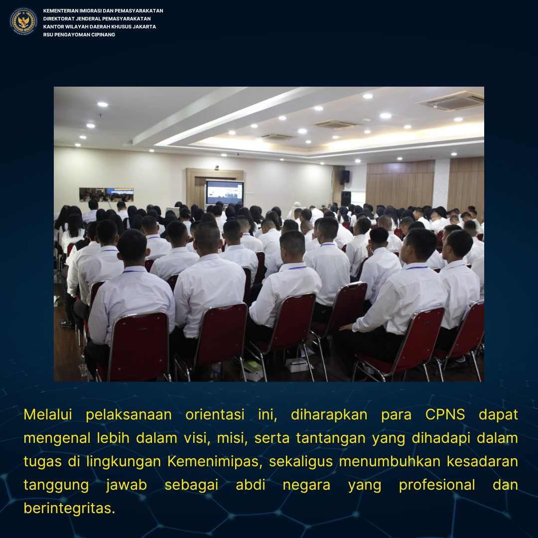 Melalui pelaksanaan orientasi ini, diharapkan para CPNS dapat mengenal lebih dalam visi, misi, serta tantangan yang dihadapi dalam tugas di lingkungan Kemenimipas, sekaligus menumbuhkan kesadaran tanggung jawab sebagai abdi negara yang profesional dan berintegritas.