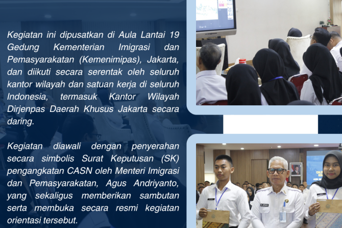 Kegiatan diawali dengan penyerahan secara simbolis Surat Keputusan (SK) pengangkatan CASN oleh Menteri Imigrasi dan Pemasyarakatan, Agus Andriyanto, yang sekaligus memberikan sambutan serta membuka secara resmi kegiatan orientasi tersebut.