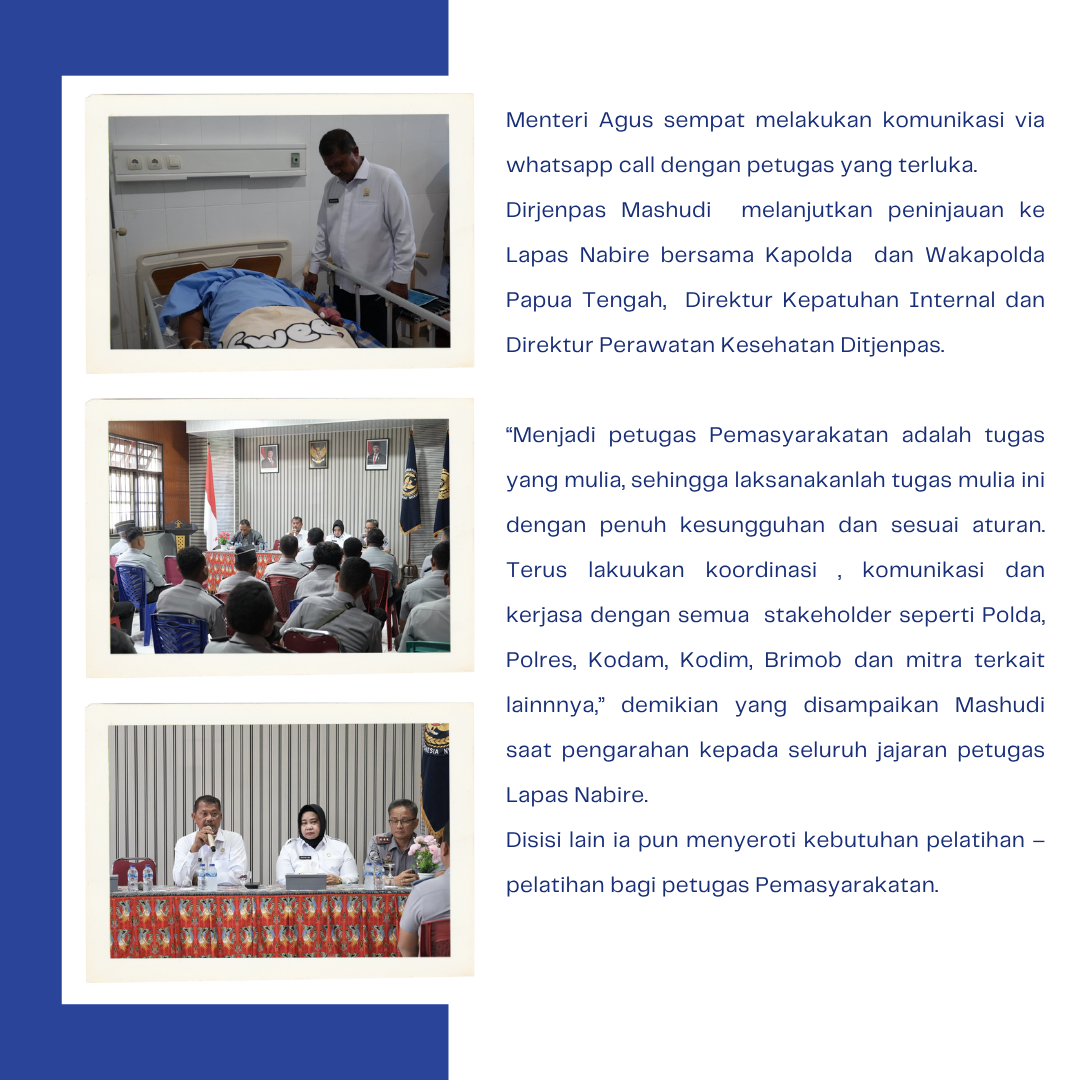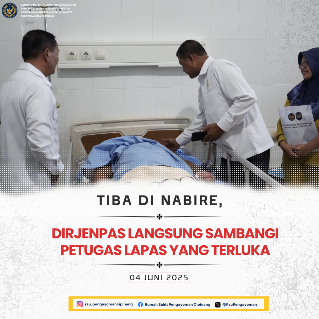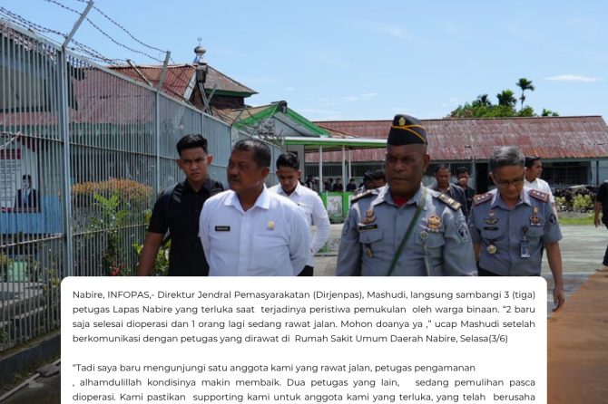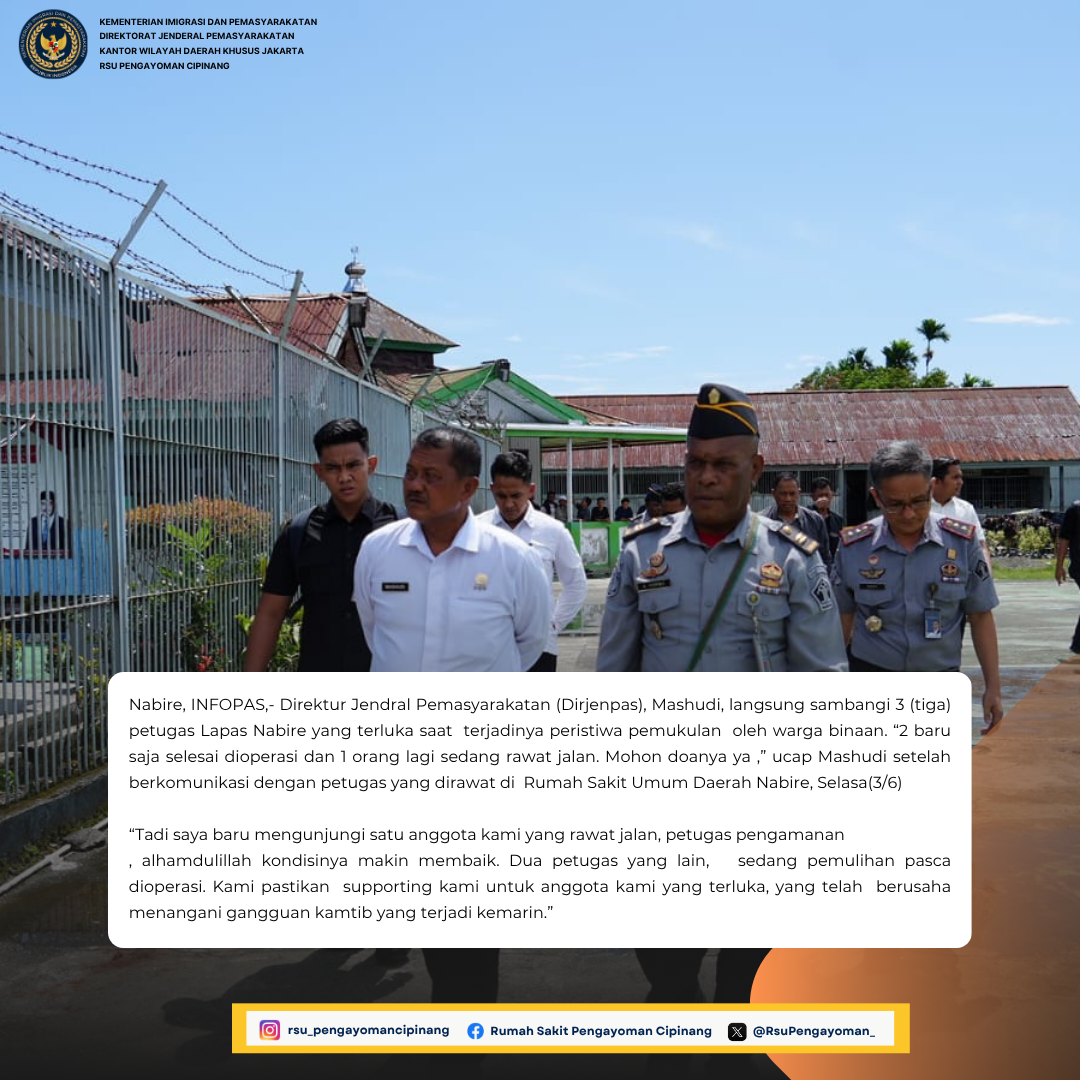Nabire, INFOPAS,- Direktur Jendral Pemasyarakatan (Dirjenpas), Mashudi, langsung sambangi 3 (tiga) petugas Lapas Nabire yang terluka saat terjadinya peristiwa pemukulan oleh warga binaan. “2 baru saja selesai dioperasi dan 1 orang lagi sedang rawat jalan. Mohon doanya ya ,” ucap Mashudi setelah berkomunikasi dengan petugas yang dirawat di Rumah Sakit Umum Daerah Nabire, Selasa(3/6)