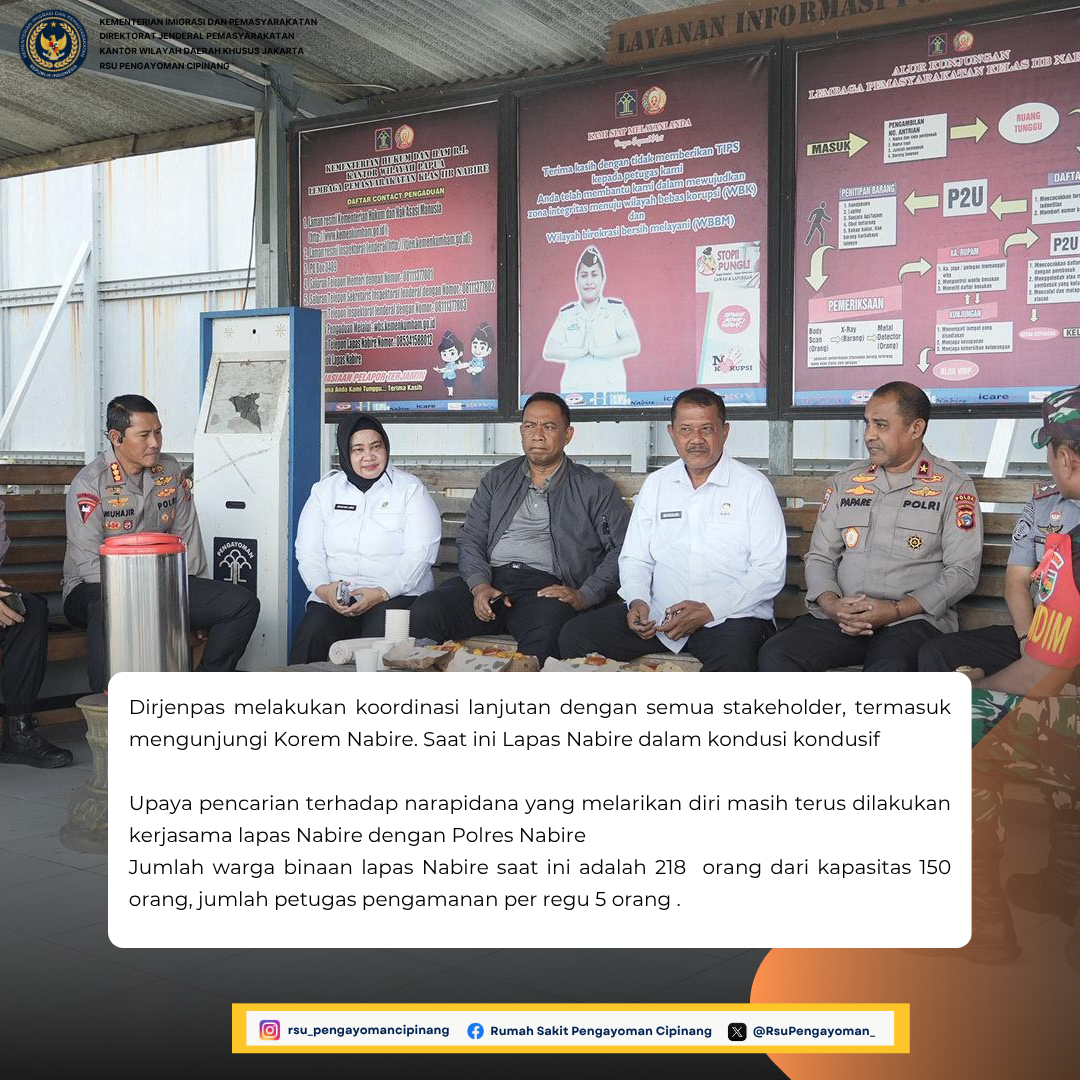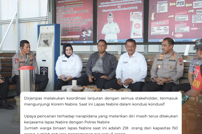 Dirjenpas melakukan koordinasi lanjutan dengan semua stakeholder, termasuk mengunjungi Korem Nabire. Saat ini Lapas Nabire dalam kondusi kondusif