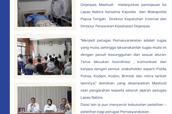 Dirjenpas Mashudi melanjutkan peninjauan ke Lapas Nabire bersama Kapolda dan Wakapolda Papua Tengah, Direktur Kepatuhan Internal dan Direktur Perawatan Kesehatan Ditjenpas.