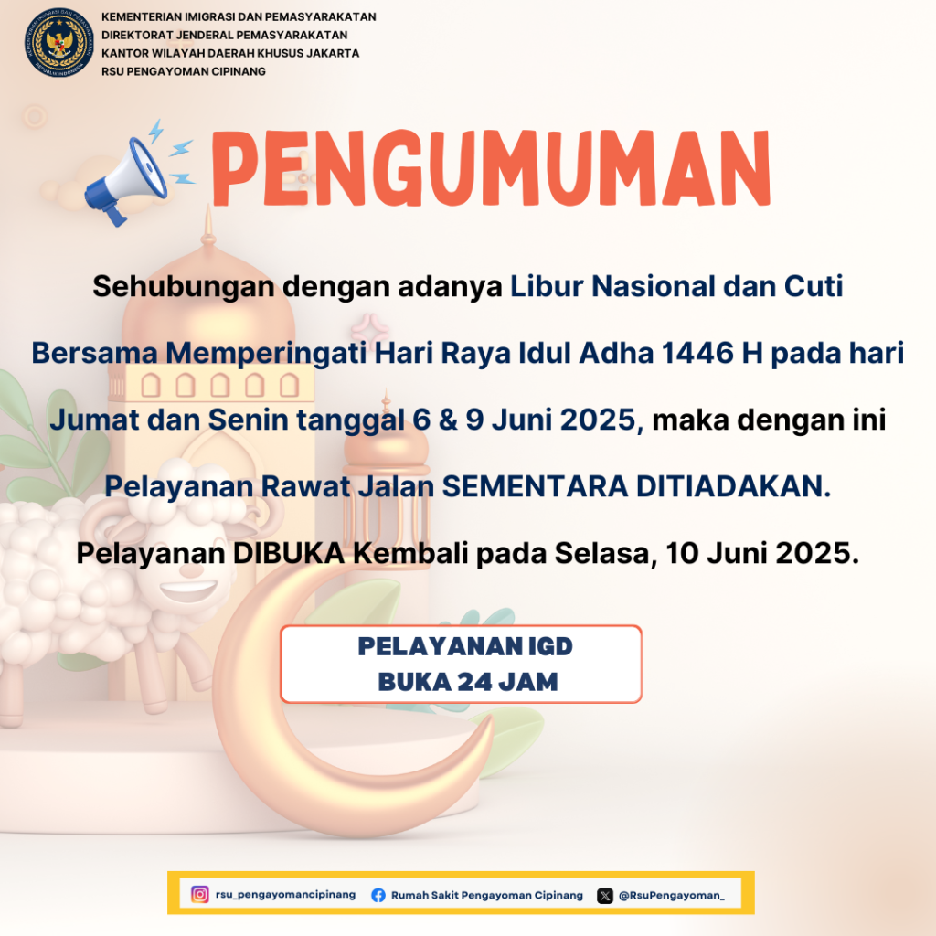 Sehubungan dengan adanya Libur Nasional dan Cuti Bersama Memperingati Hari Raya Idul Adha 1446 H pada hari Jumat dan Senin tanggal 6 & 9 Juni 2025, maka dengan ini Pelayanan Rawat Jalan SEMENTARA DITIADAKAN.