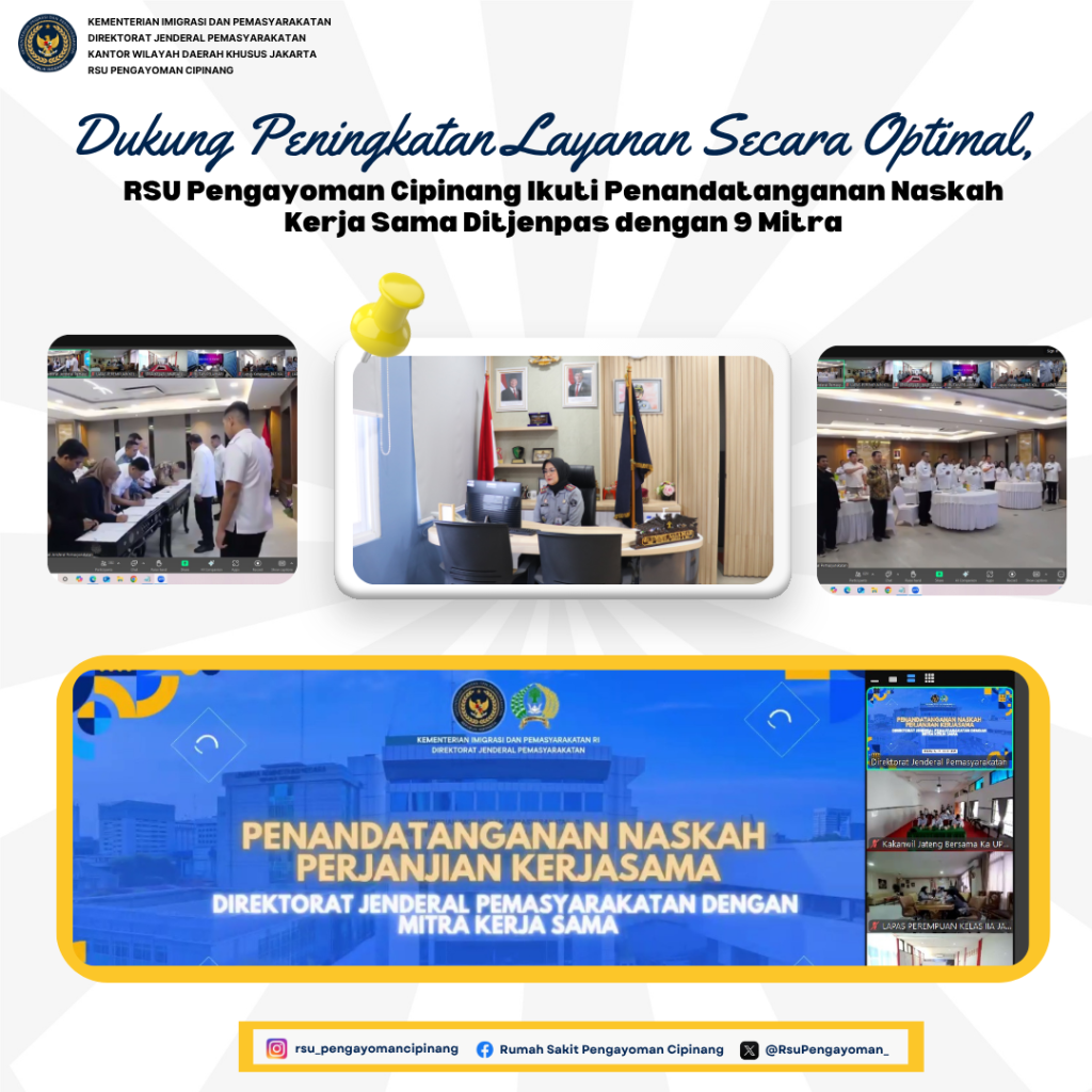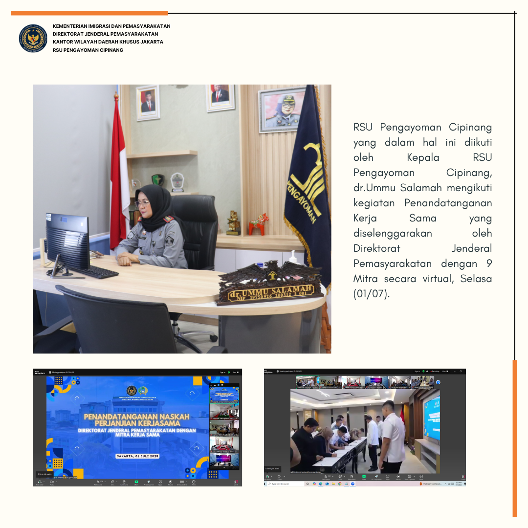 RSU Pengayoman Cipinang yang dalam hal ini diikuti oleh Kepala RSU Pengayoman Cipinang, dr.Ummu Salamah mengikuti kegiatan Penandatanganan Kerja Sama yang diselenggarakan oleh Direktorat Jenderal Pemasyarakatan dengan 9 Mitra secara virtual, Selasa (01/07).
