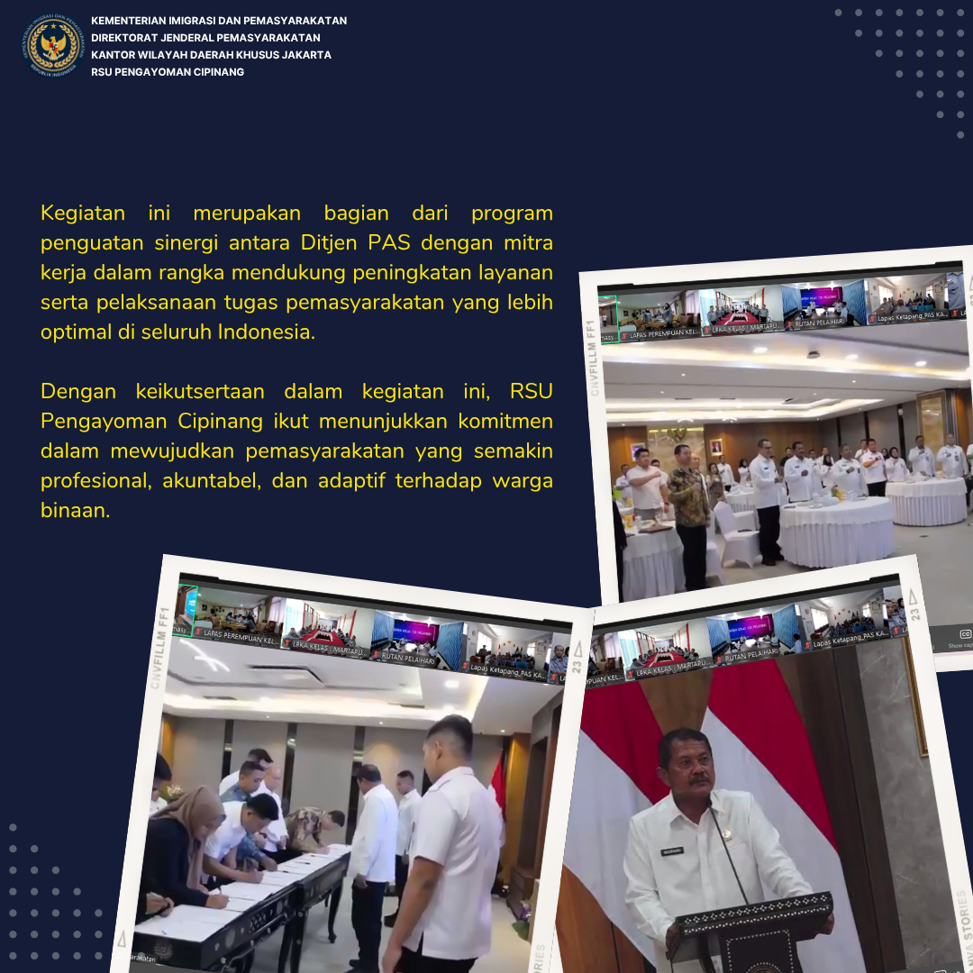 Kegiatan ini merupakan bagian dari program penguatan sinergi antara Ditjen PAS dengan mitra kerja dalam rangka mendukung peningkatan layanan serta pelaksanaan tugas pemasyarakatan yang lebih optimal di seluruh Indonesia.