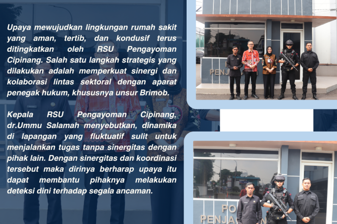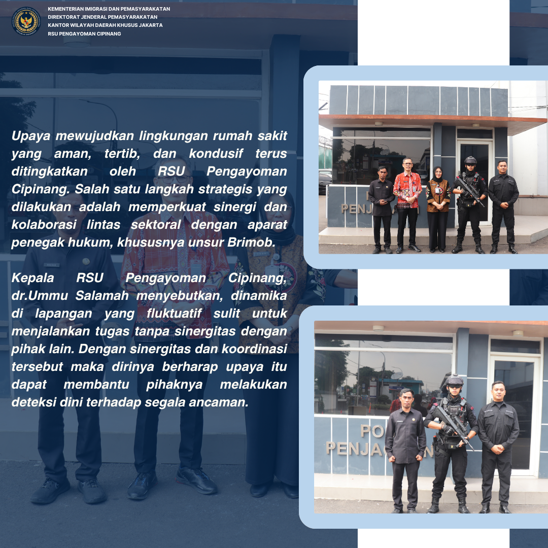 Upaya mewujudkan lingkungan rumah sakit yang aman, tertib, dan kondusif terus ditingkatkan oleh RSU Pengayoman Cipinang. Salah satu langkah strategis yang dilakukan adalah memperkuat sinergi dan kolaborasi lintas sektoral dengan aparat penegak hukum, khususnya unsur Brimob.