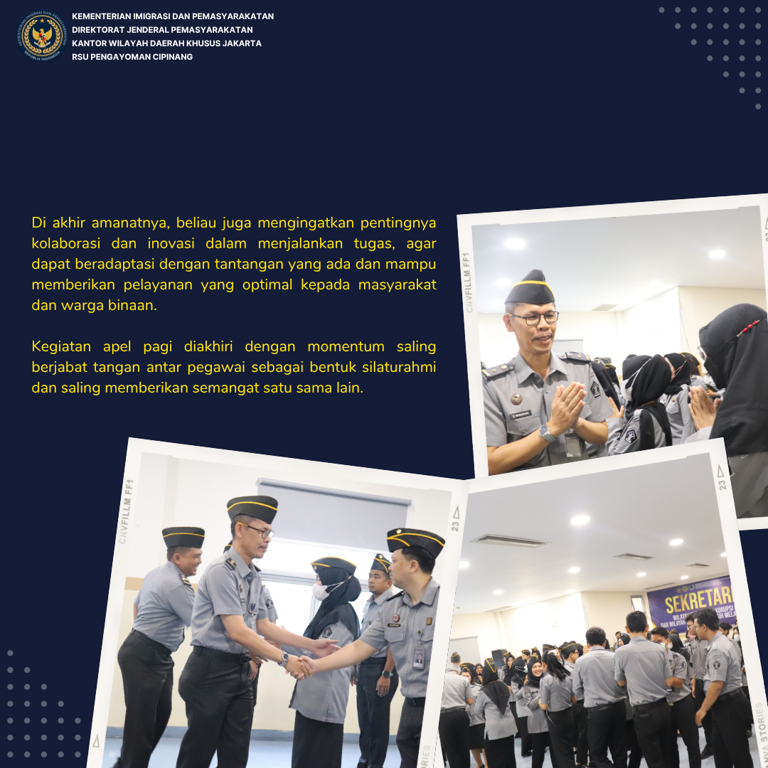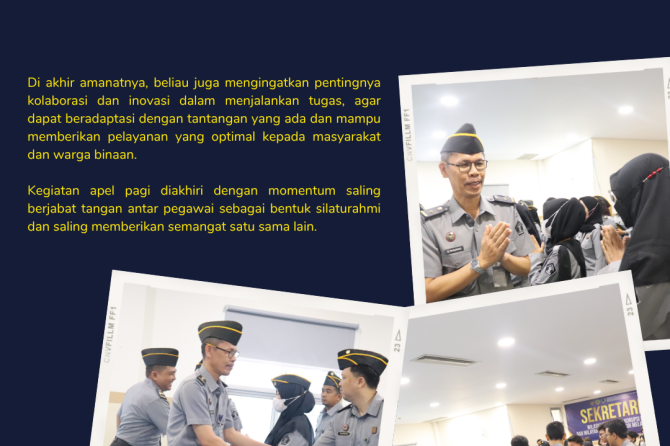 Di akhir amanatnya, beliau juga mengingatkan pentingnya kolaborasi dan inovasi dalam menjalankan tugas, agar dapat beradaptasi dengan tantangan yang ada dan mampu memberikan pelayanan yang optimal kepada masyarakat dan warga binaan.