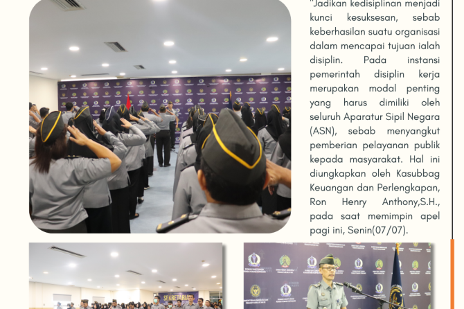“Jadikan kedisiplinan menjadi kunci kesuksesan, keberhasilan suatu organisasi dalam mencapai tujuan ialah disiplin. Pada instansi pemerintah disiplin kerja merupakan modal penting yang harus dimiliki oleh seluruh Aparatur Sipil Negara (ASN), sebab menyangkut pemberian pelayanan publik kepada masyarakat. Hal ini diungkapkan oleh Kasubbag Keuangan dan Perlengkapan, Ron Henry Anthony,S.H., pada saat memimpin apel pagi ini, Senin(07/07).