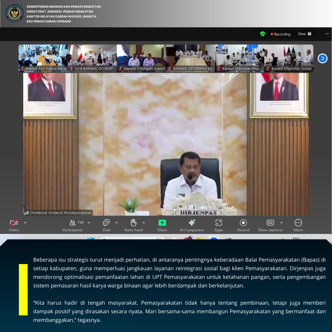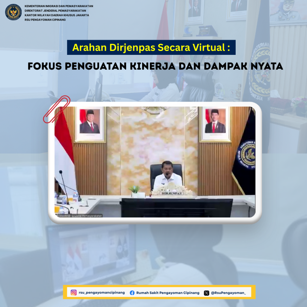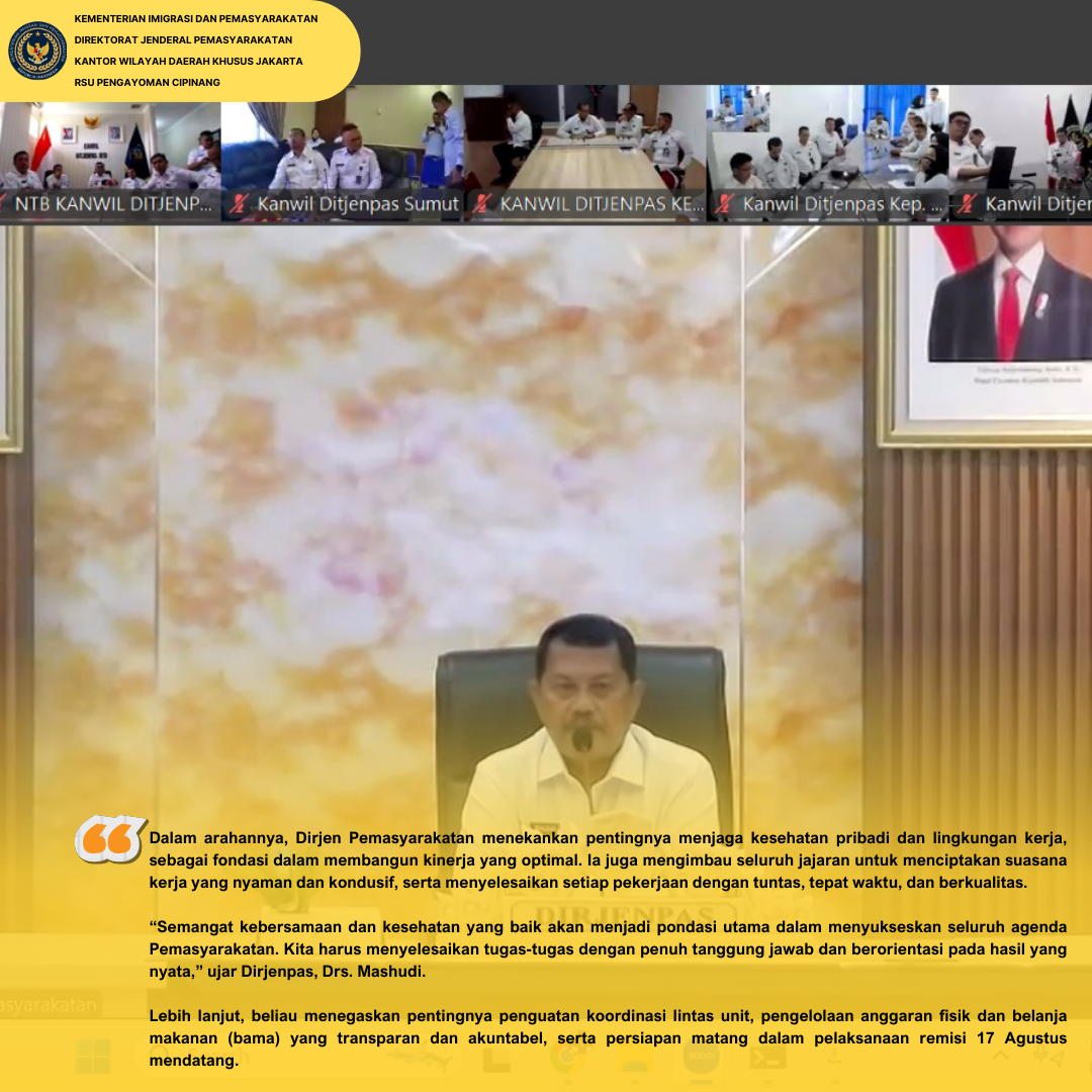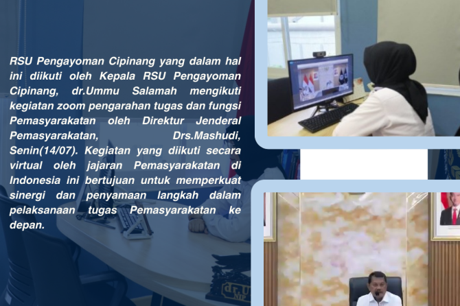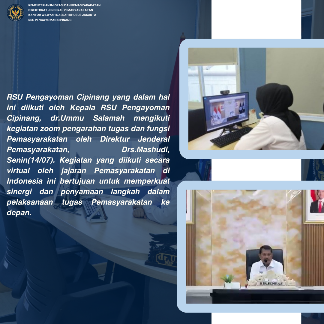 RSU Pengayoman Cipinang yang dalam hal ini diikuti oleh Kepala RSU Pengayoman Cipinang, dr.Ummu Salamah mengikuti kegiatan zoom pengarahan tugas dan fungsi Pemasyarakatan oleh Direktur Jenderal Pemasyarakatan, Drs.Mashudi, Senin(14/07). Kegiatan yang diikuti secara virtual oleh jajaran Pemasyarakatan di Indonesia ini bertujuan untuk memperkuat sinergi dan penyamaan langkah dalam pelaksanaan tugas Pemasyarakatan ke depan.