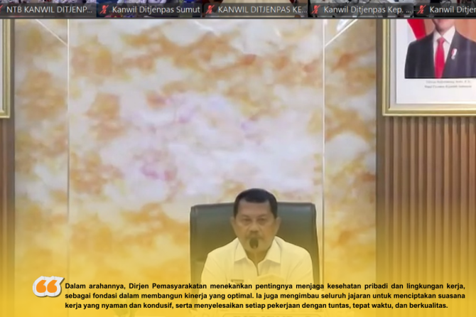 Dalam arahannya, Dirjen Pemasyarakatan menekankan pentingnya menjaga kesehatan pribadi dan lingkungan kerja, sebagai fondasi dalam membangun kinerja yang optimal. Ia juga mengimbau seluruh jajaran untuk menciptakan suasana kerja yang nyaman dan kondusif, serta menyelesaikan setiap pekerjaan dengan tuntas, tepat waktu, dan berkualitas.