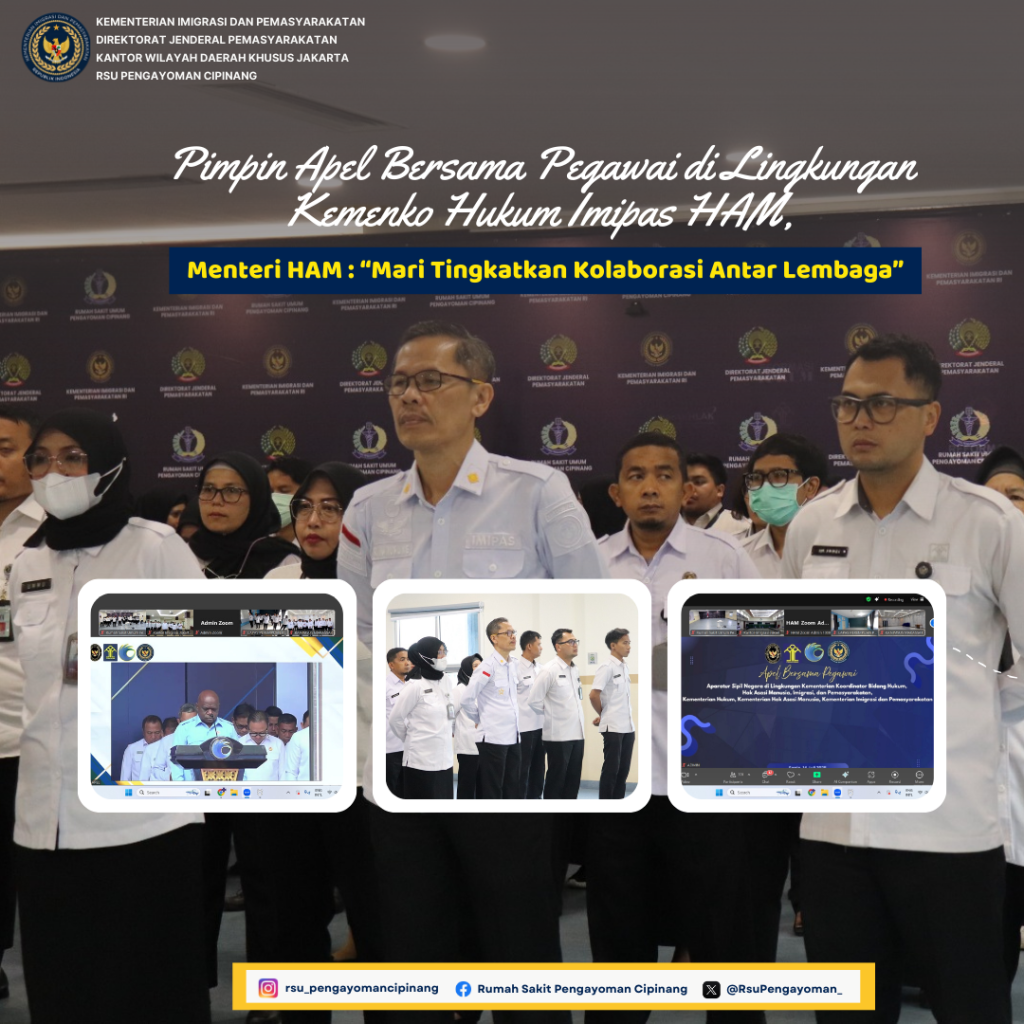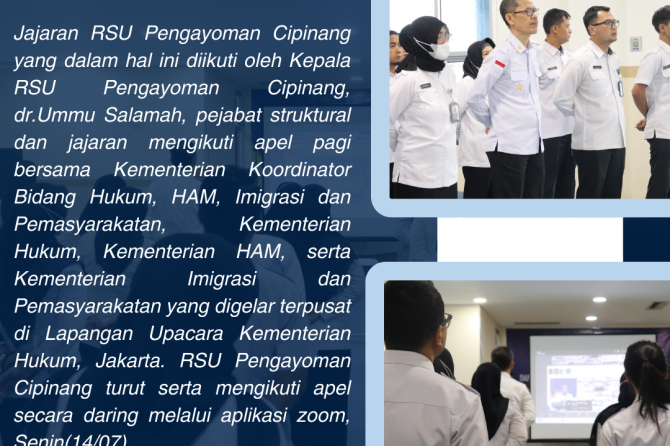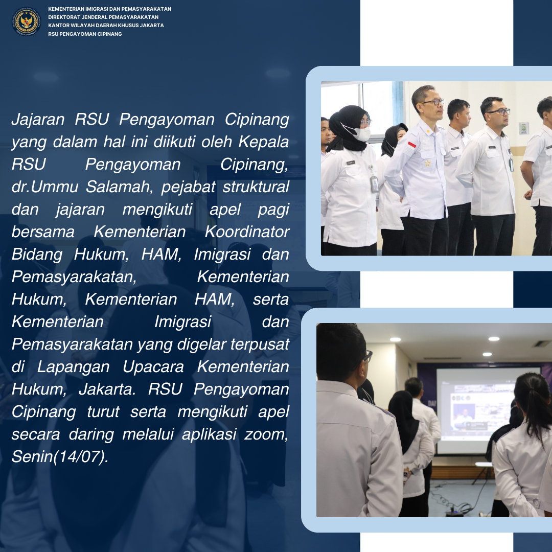 Jajaran RSU Pengayoman Cipinang yang dalam hal ini diikuti oleh Kepala RSU Pengayoman Cipinang, dr.Ummu Salamah, pejabat struktural dan jajaran mengikuti apel pagi bersama Kementerian Koordinator Bidang Hukum, HAM, Imigrasi dan Pemasyarakatan, Kementerian Hukum, Kementerian HAM, serta Kementerian Imigrasi dan Pemasyarakatan yang digelar terpusat di Lapangan Upacara Kementerian Hukum, Jakarta. RSU Pengayoman Cipinang turut serta mengikuti apel secara daring melalui aplikasi zoom, Senin(14/07).