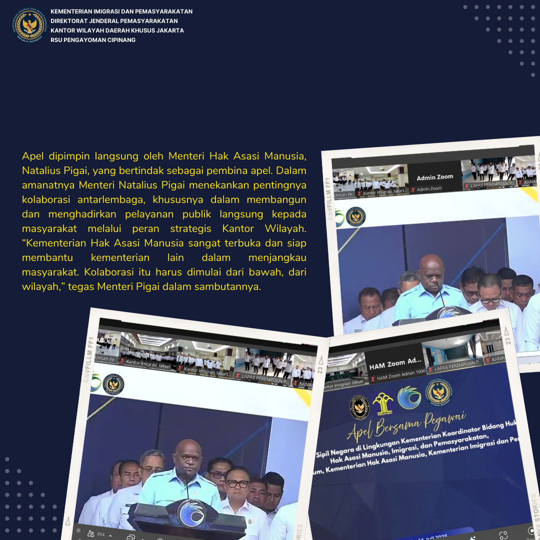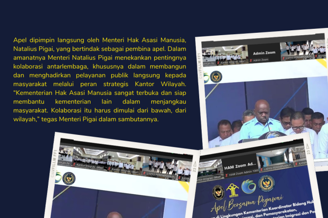 Apel dipimpin langsung oleh Menteri Hak Asasi Manusia, Natalius Pigai, yang bertindak sebagai pembina apel. Dalam amanatnya Menteri Natalius Pigai menekankan pentingnya kolaborasi antarlembaga, khususnya dalam membangun dan menghadirkan pelayanan publik langsung kepada masyarakat melalui peran strategis Kantor Wilayah. “Kementerian Hak Asasi Manusia sangat terbuka dan siap membantu kementerian lain dalam menjangkau masyarakat. Kolaborasi itu harus dimulai dari bawah, dari wilayah,” tegas Menteri Pigai dalam sambutannya.