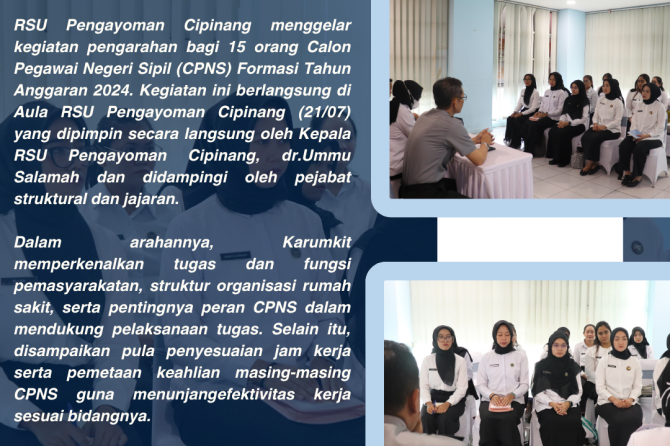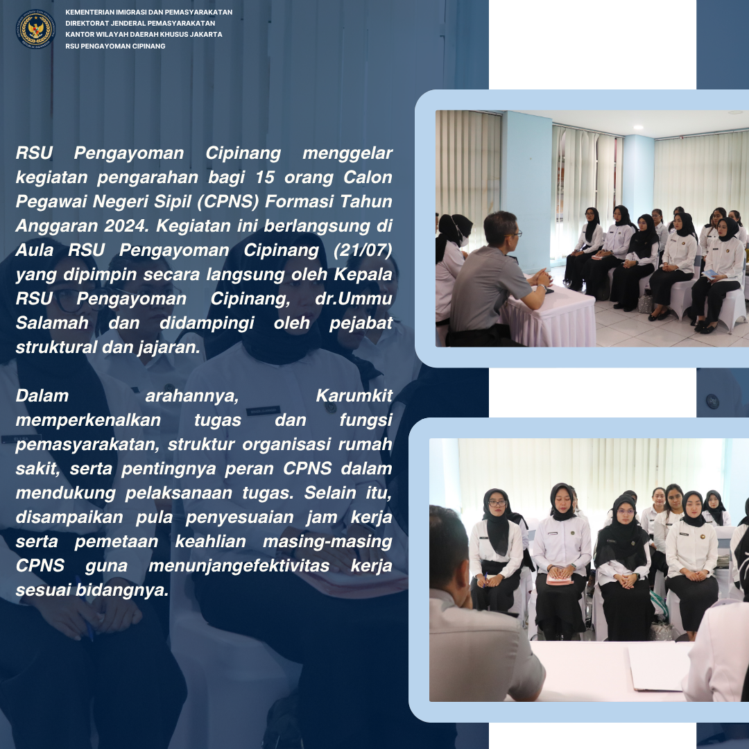 RSU Pengayoman Cipinang menggelar kegiatan pengarahan bagi 15 orang Calon Pegawai Negeri Sipil (CPNS) Formasi Tahun Anggaran 2024. Kegiatan ini berlangsung di Aula RSU Pengayoman Cipinang (21/07) yang dipimpin secara langsung oleh Kepala RSU Pengayoman Cipinang, dr.Ummu Salamah dan didampingi oleh pejabat struktural dan jajaran.