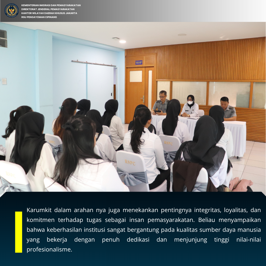 Karumkit dalam arahan nya juga menekankan pentingnya integritas, loyalitas, dan komitmen terhadap tugas sebagai insan pemasyarakatan. Beliau menyampaikan bahwa keberhasilan institusi sangat bergantung pada kualitas sumber daya manusia yang bekerja dengan penuh dedikasi dan menjunjung tinggi nilai-nilai profesionalisme.