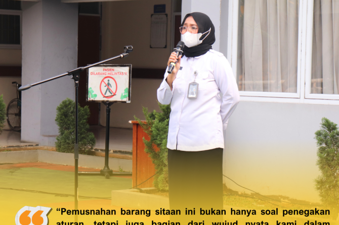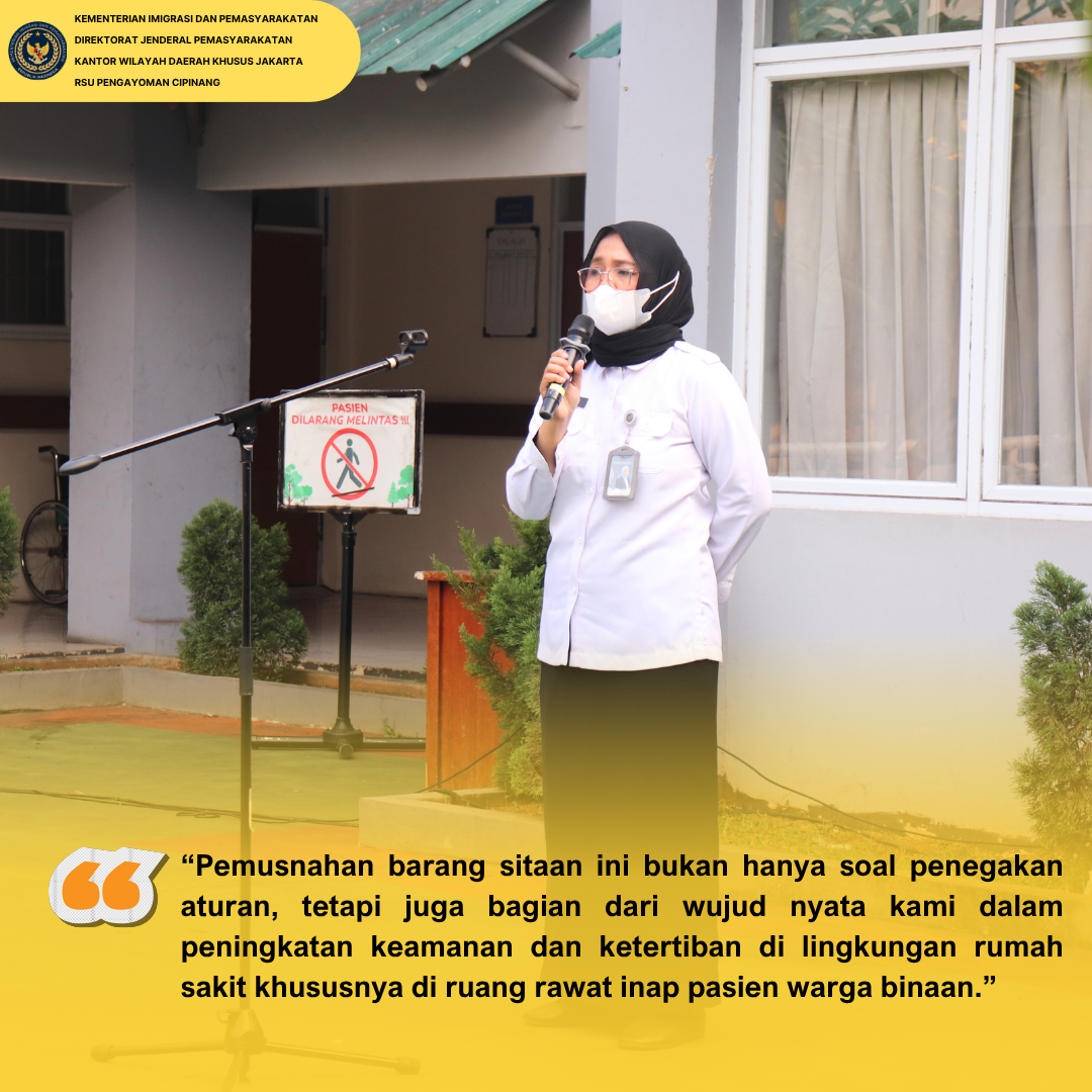 Dalam sambutannya, Kepala RSU Pengayoman Cipinang, dr.Ummu Salamah menyampaikan bahwa kegiatan ini merupakan bukti nyata keseriusan seluruh jajaran petugas dalam menjaga integritas, sekaligus menciptakan lingkungan pemasyarakatan yang aman, tertib, dan kondusif. “Pemusnahan barang sitaan ini bukan hanya soal penegakan aturan, tetapi juga bagian dari wujud nyata kami dalam peningkatan keamanan dan ketertiban di lingkungan rumah sakit khususnya di ruang rawat inap pasien warga binaan.