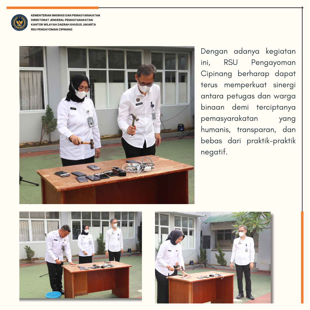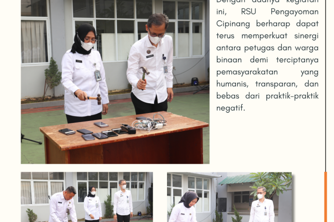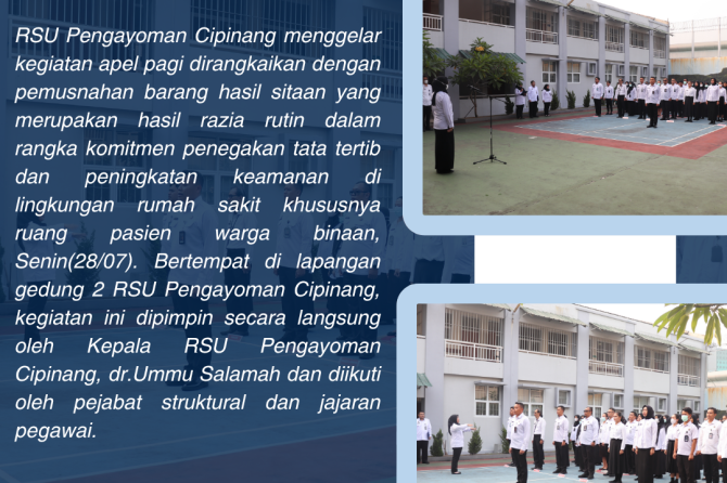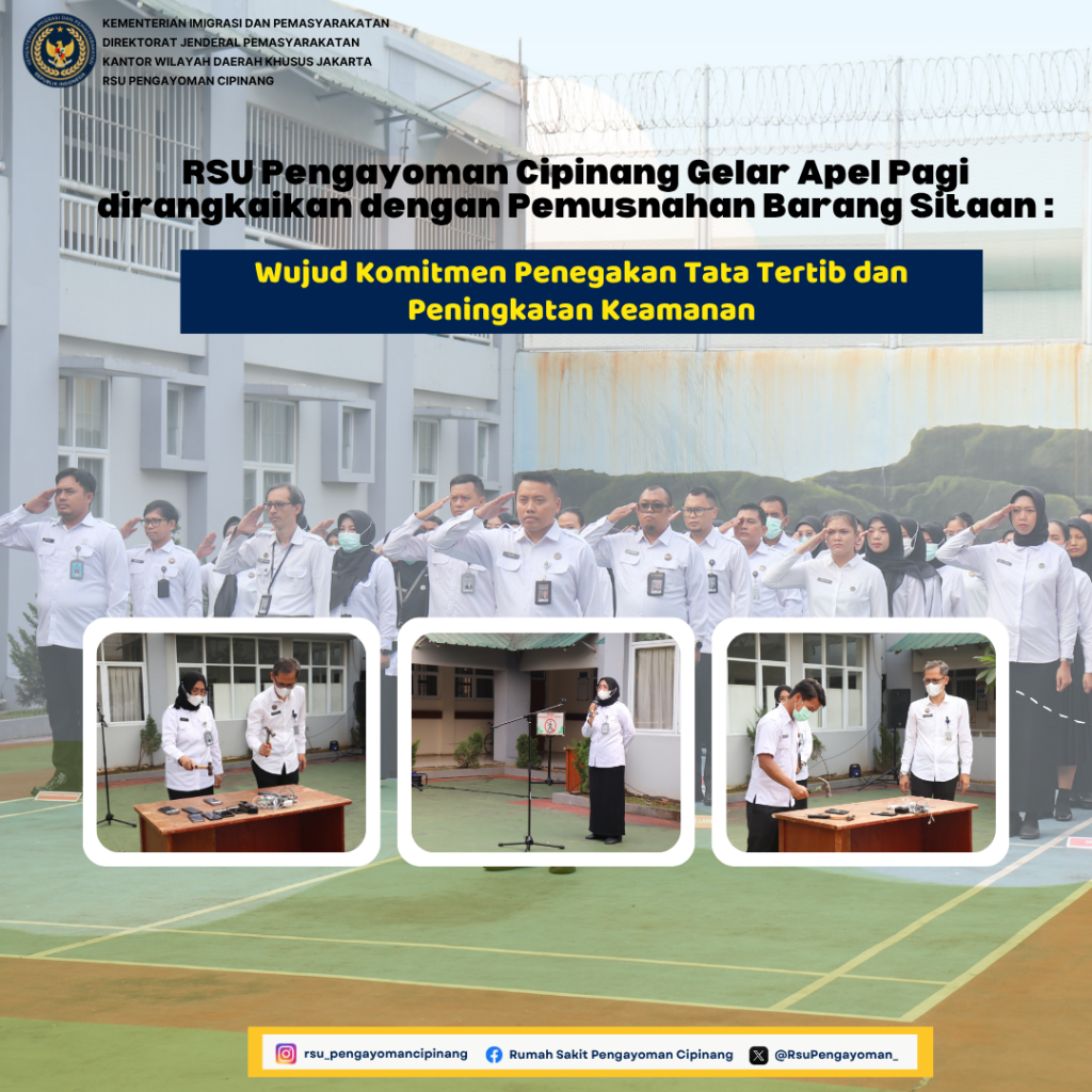 RSU Pengayoman Cipinang menggelar kegiatan apel pagi dirangkaikan dengan pemusnahan barang hasil sitaan yang merupakan hasil razia rutin dalam rangka komitmen penegakan tata tertib dan peningkatan keamanan di lingkungan rumah sakit khususnya ruang pasien warga binaan, Senin(28/07). Bertempat di lapangan gedung 2 RSU Pengayoman Cipinang, kegiatan ini dipimpin secara langsung oleh Kepala RSU Pengayoman Cipinang, dr.Ummu Salamah dan diikuti oleh pejabat struktural dan jajaran pegawai.