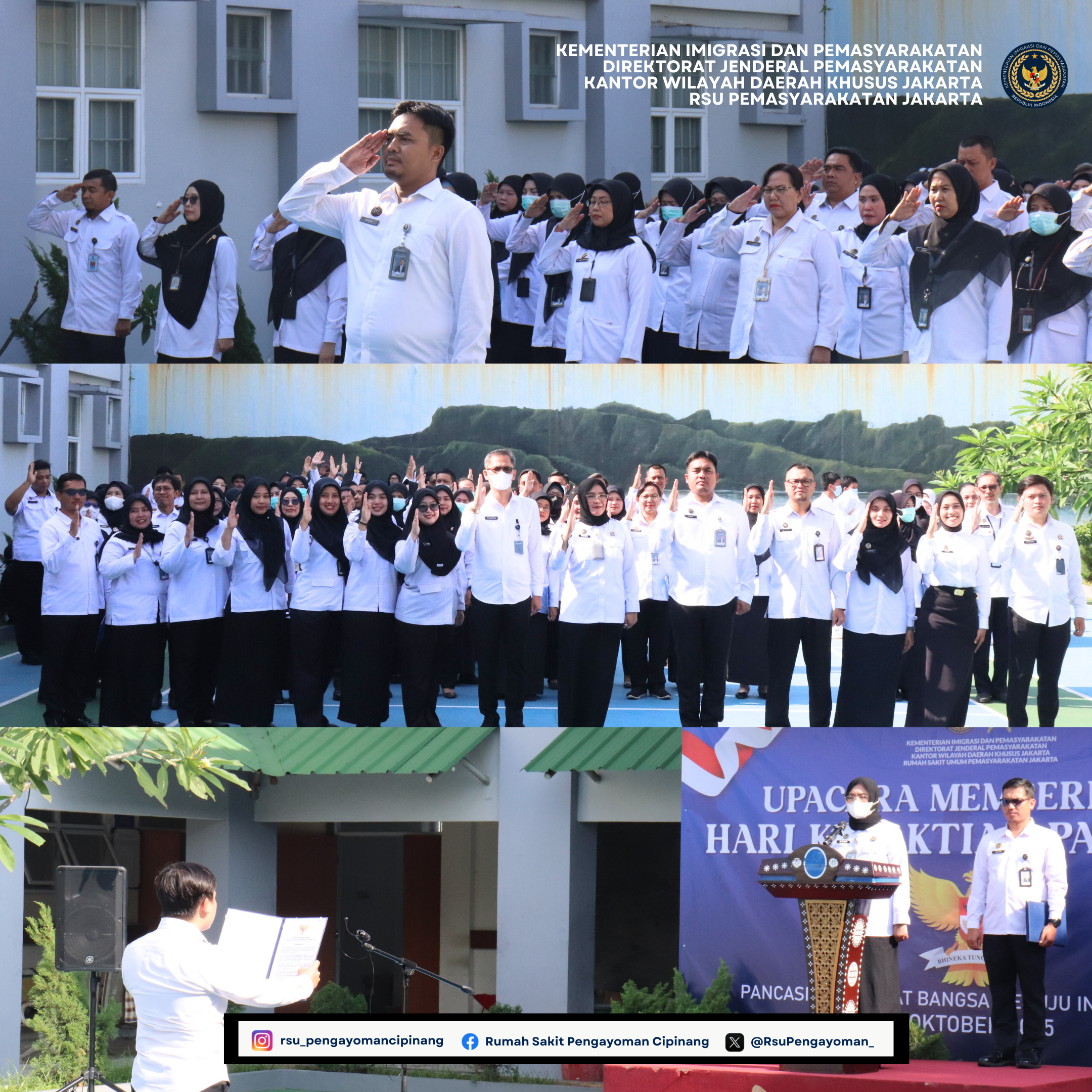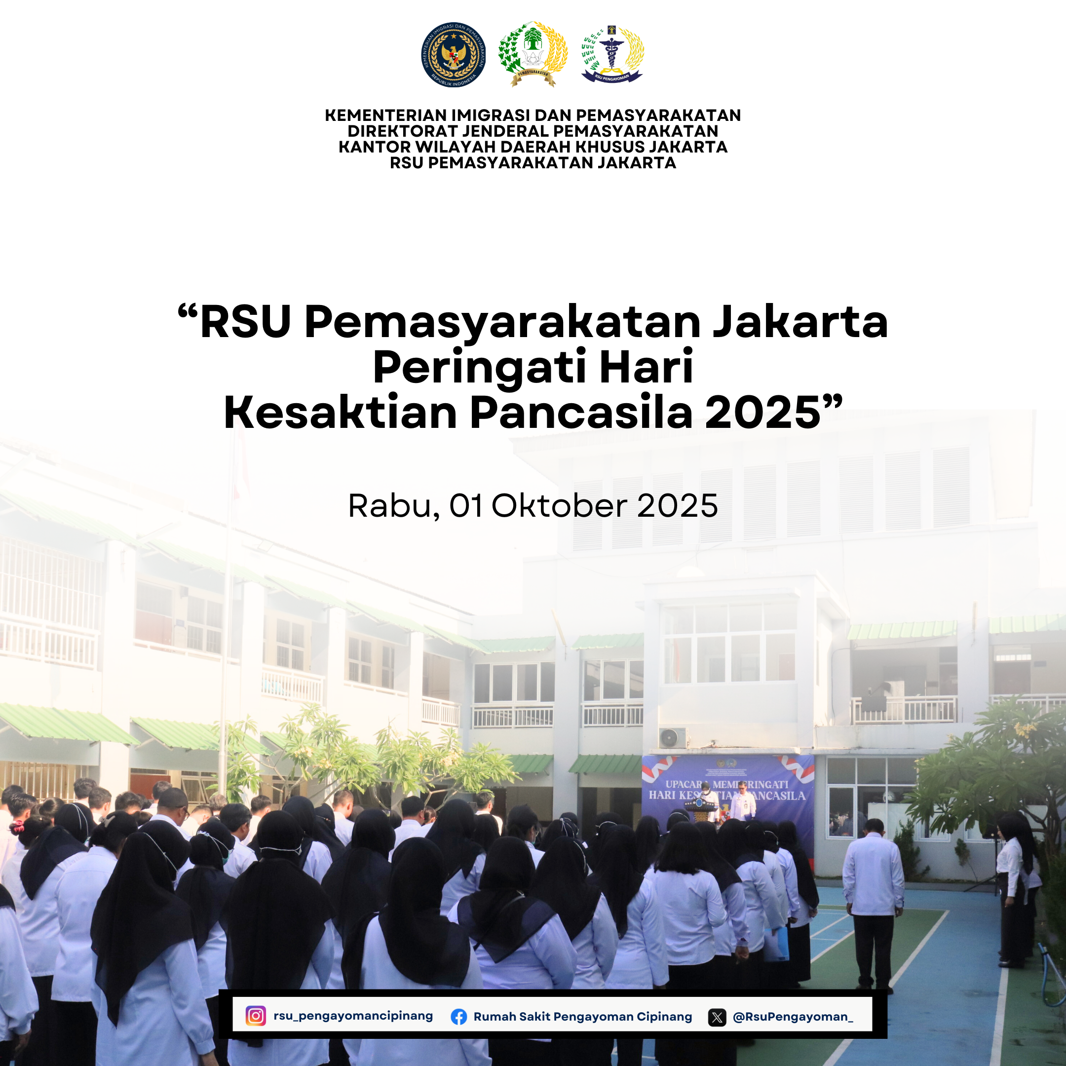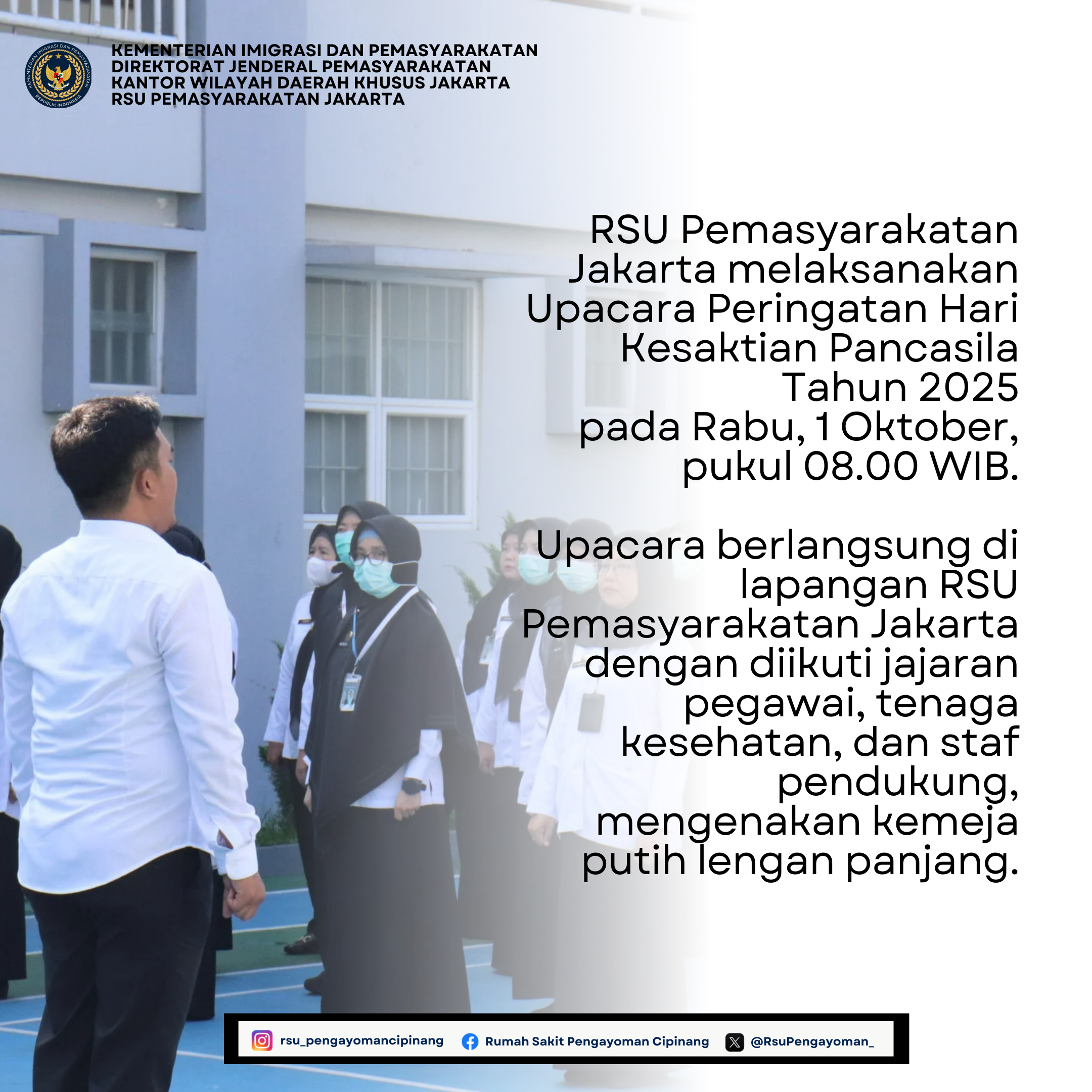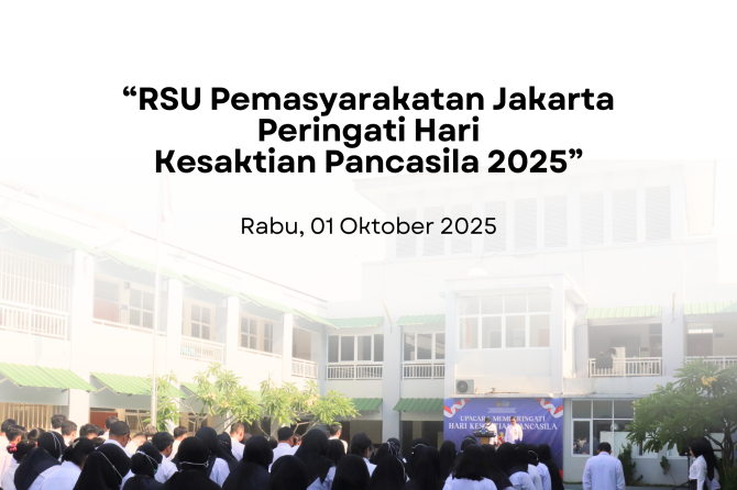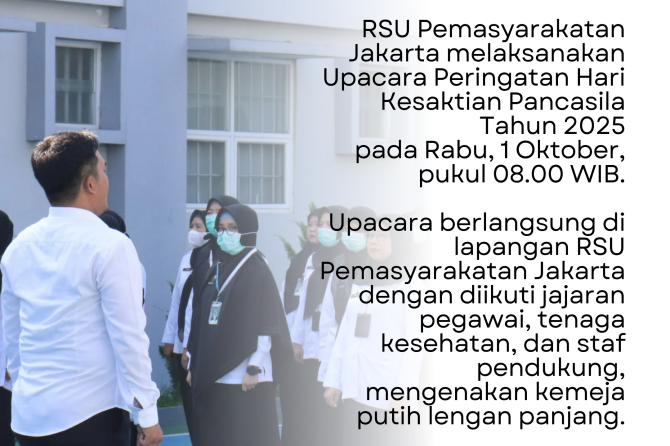 RSU Pemasyarakatan Jakarta melaksanakan Upacara Peringatan Hari Kesaktian Pancasila Tahun 2025 pada Rabu, 1 Oktober, pukul 08.00 WIB. Upacara berlangsung di lapangan RSU Pemasyarakatan Jakarta dengan diikuti jajaran pegawai, tenaga kesehatan, dan staf pendukung, mengenakan kemeja putih lengan panjang.