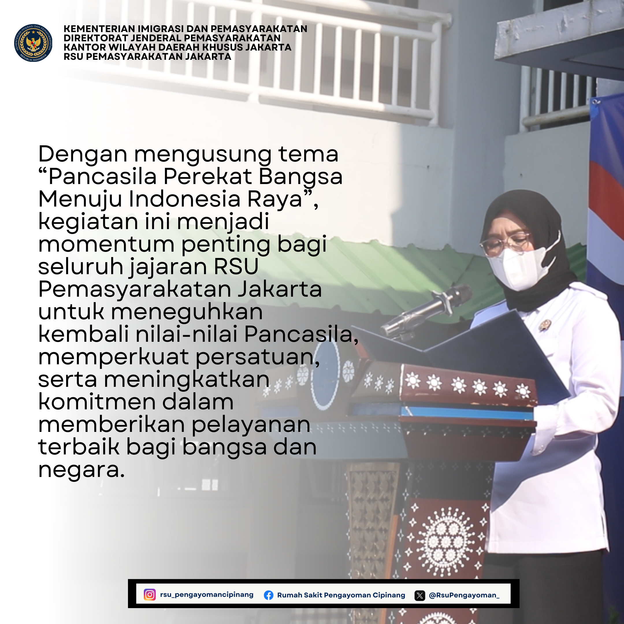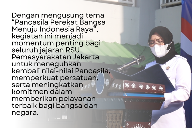 Dengan mengusung tema “Pancasila Perekat Bangsa Menuju Indonesia Raya”, kegiatan ini menjadi momentum penting bagi seluruh jajaran RSU Pemasyarakatan Jakarta untuk meneguhkan kembali nilai-nilai Pancasila, memperkuat persatuan, serta meningkatkan komitmen dalam memberikan pelayanan terbaik bagi bangsa dan negara.
