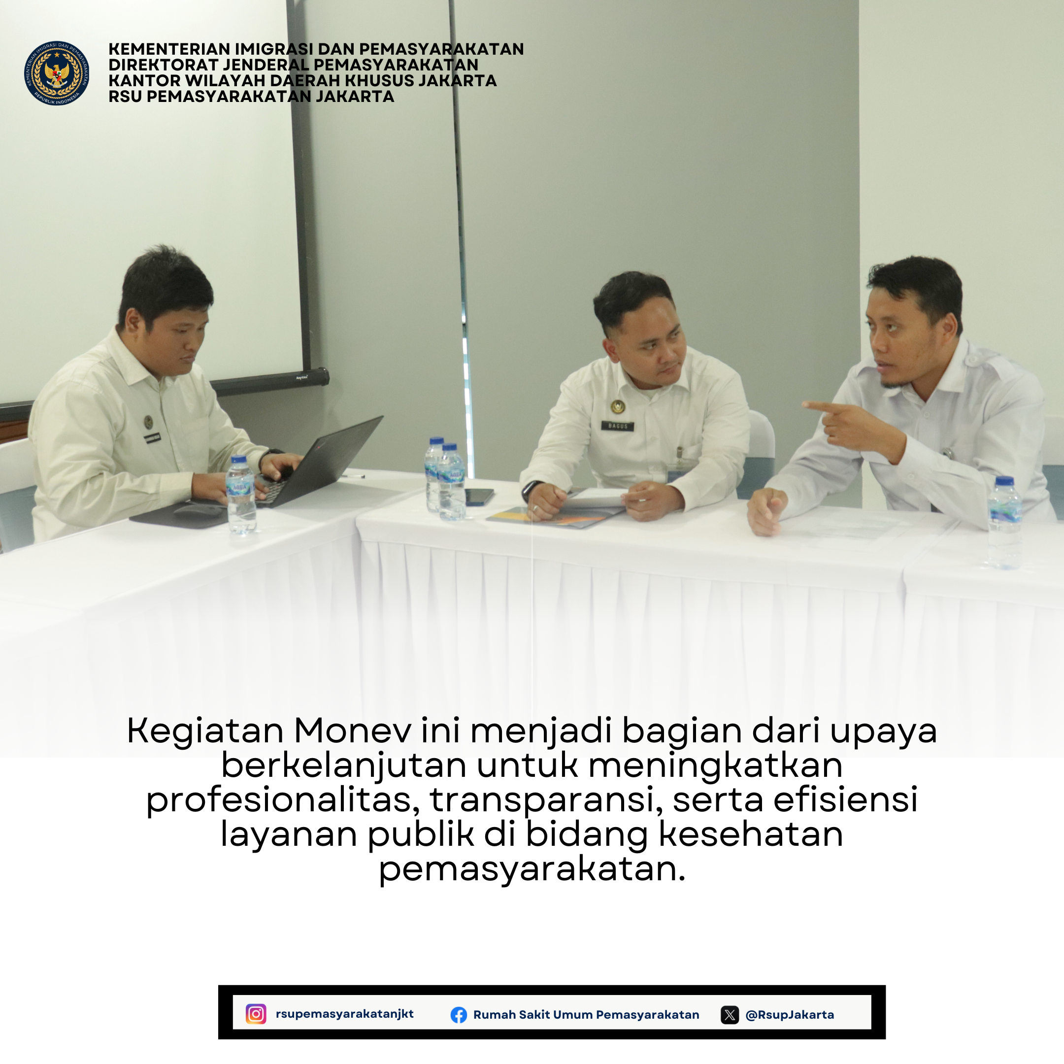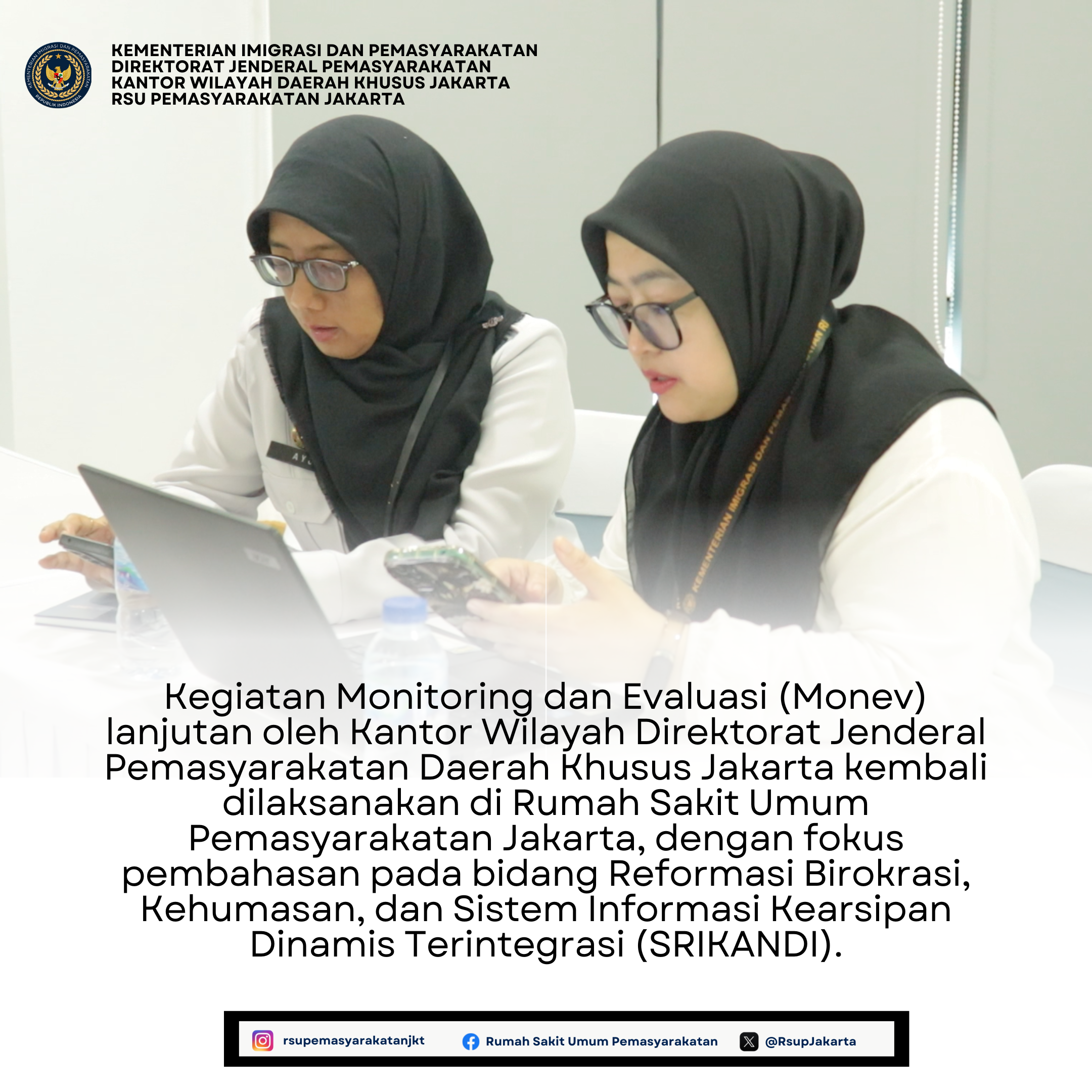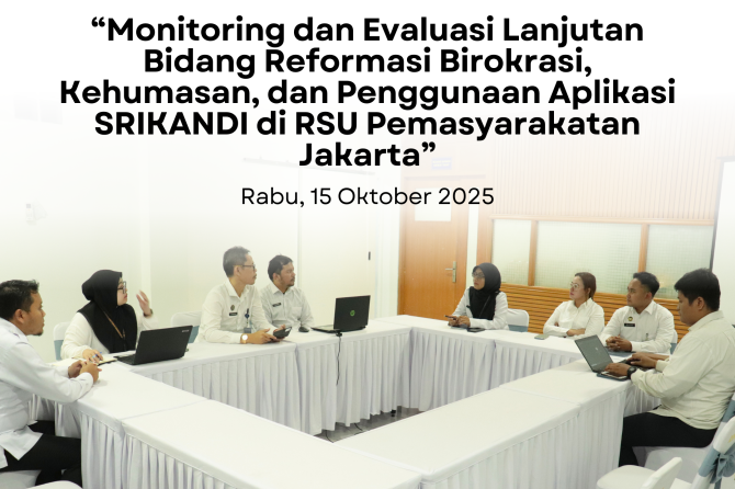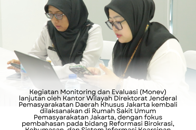 Kegiatan Monitoring dan Evaluasi (Monev) lanjutan oleh Kantor Wilayah Direktorat Jenderal Pemasyarakatan Daerah Khusus Jakarta kembali dilaksanakan di Rumah Sakit Umum Pemasyarakatan Jakarta, dengan fokus pembahasan pada bidang Reformasi Birokrasi, Kehumasan, dan Sistem Informasi Kearsipan Dinamis Terintegrasi (SRIKANDI).