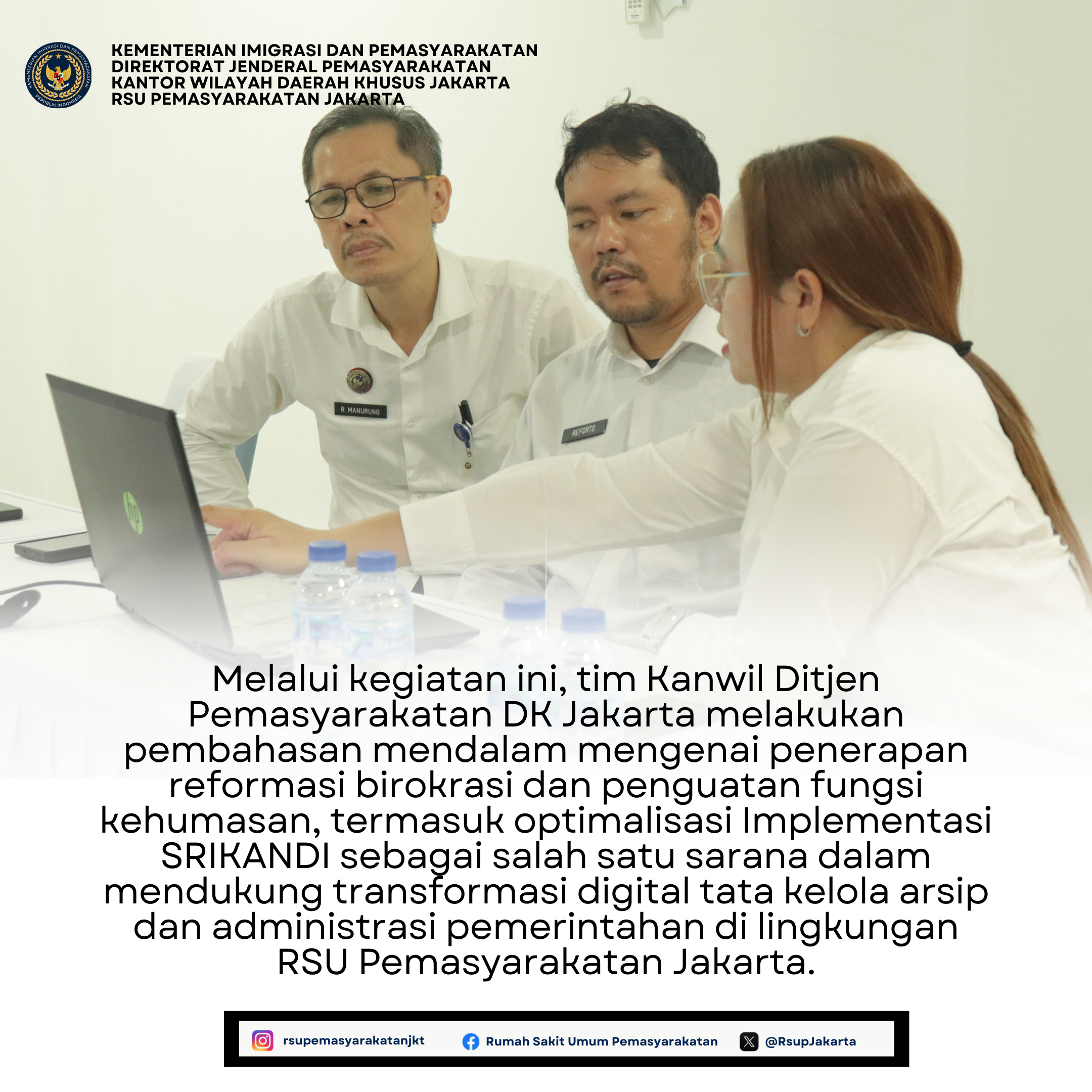 Melalui kegiatan ini, tim Kanwil Ditjen Pemasyarakatan DK Jakarta melakukan pembahasan mendalam mengenai penerapan reformasi birokrasi dan penguatan fungsi kehumasan, termasuk optimalisasi Implementasi SRIKANDI sebagai salah satu sarana dalam mendukung transformasi digital tata kelola arsip dan administrasi pemerintahan di lingkungan RSU Pemasyarakatan Jakarta.