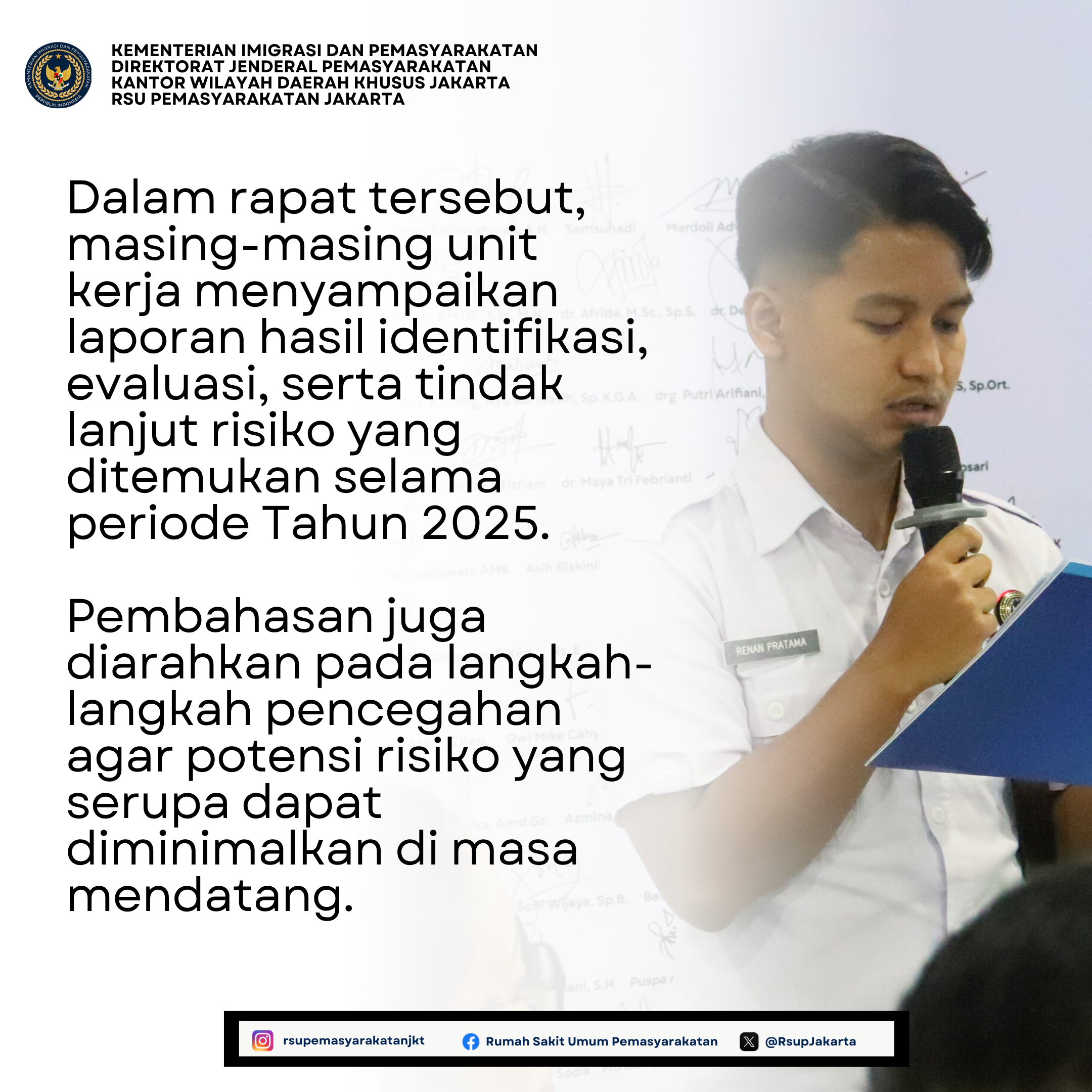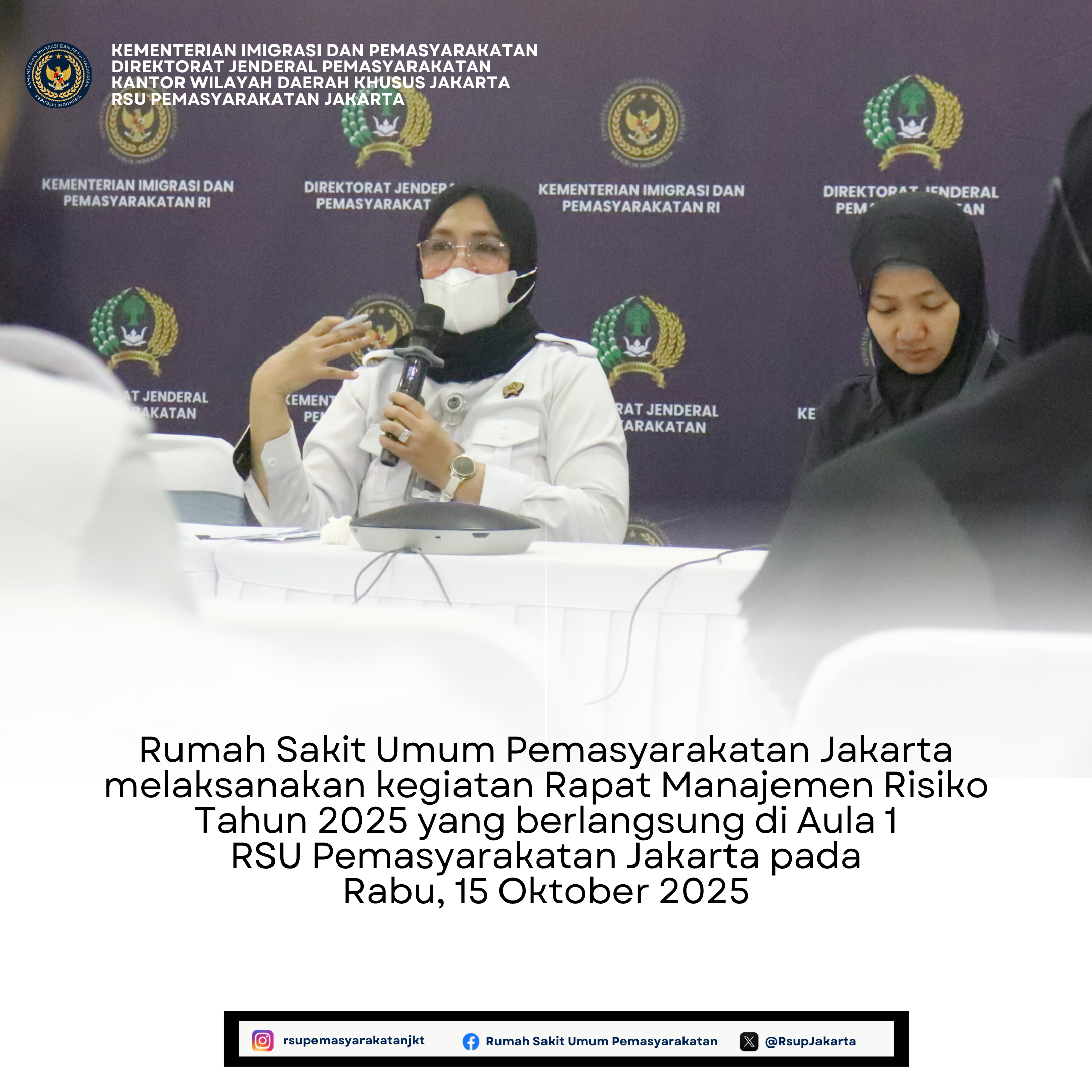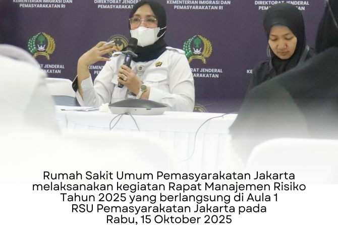 Rumah Sakit Umum Pemasyarakatan Jakarta melaksanakan kegiatan Rapat Manajemen Risiko Semester I Tahun 2025 yang berlangsung di Aula 1 RSU Pemasyarakatan Jakarta pada Rabu, 15 Oktober 2025