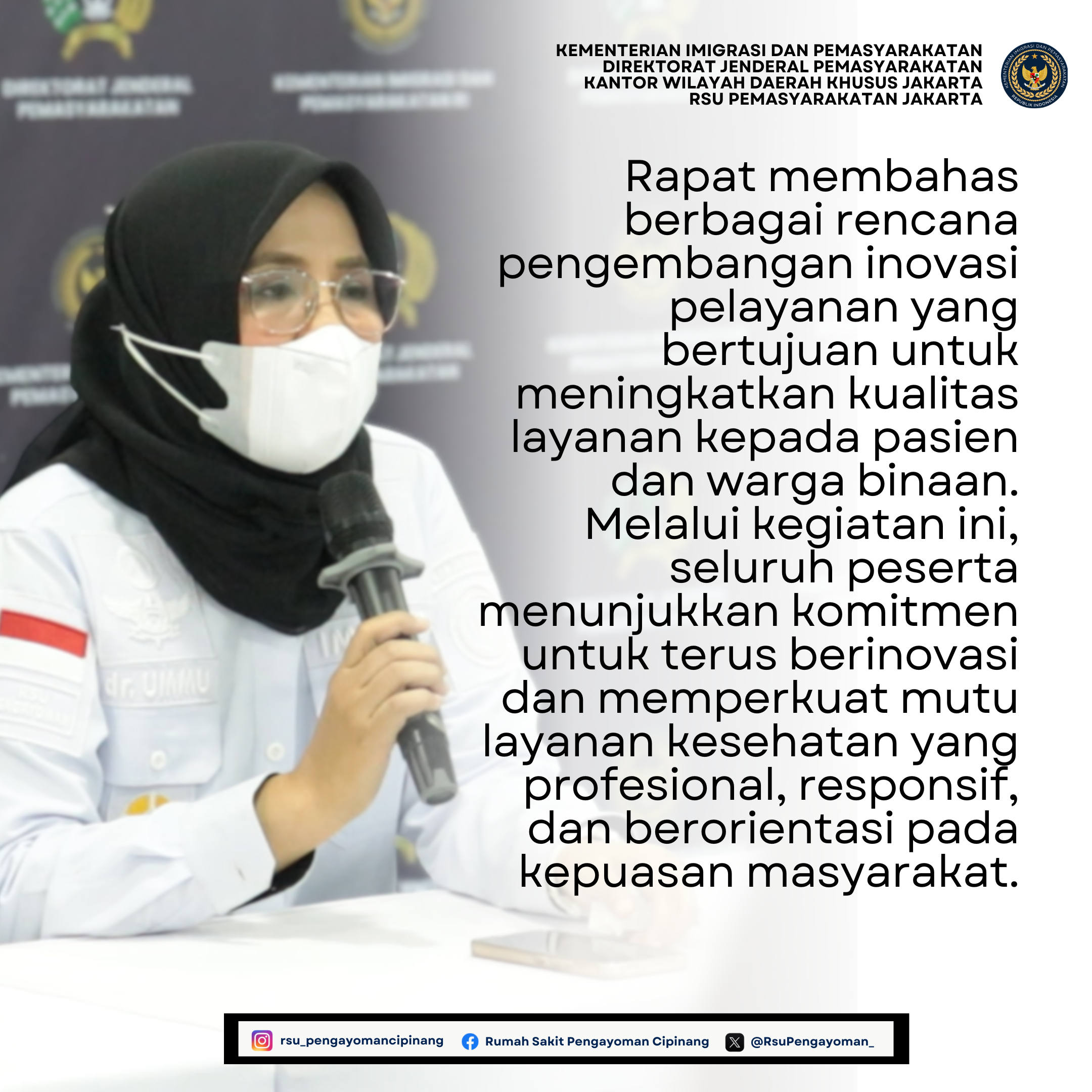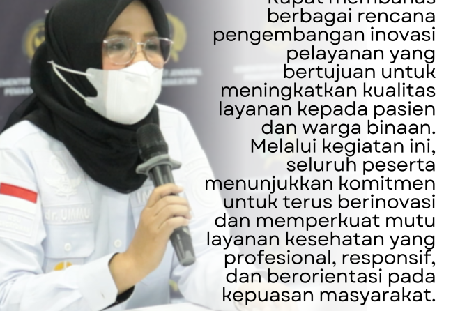 Rapat membahas berbagai rencana pengembangan inovasi pelayanan yang bertujuan untuk meningkatkan kualitas layanan kepada pasien dan warga binaan. Melalui kegiatan ini, seluruh peserta menunjukkan komitmen untuk terus berinovasi dan memperkuat mutu layanan kesehatan yang profesional, responsif, dan berorientasi pada kepuasan masyarakat.