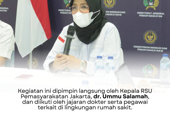 Kegiatan ini dipimpin langsung oleh Kepala RSU Pemasyarakatan Jakarta, dr. Ummu Salamah, dan diikuti oleh jajaran dokter serta pegawai terkait di lingkungan rumah sakit.