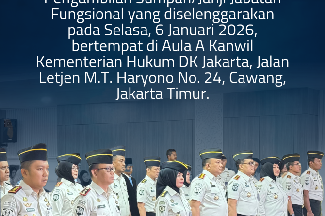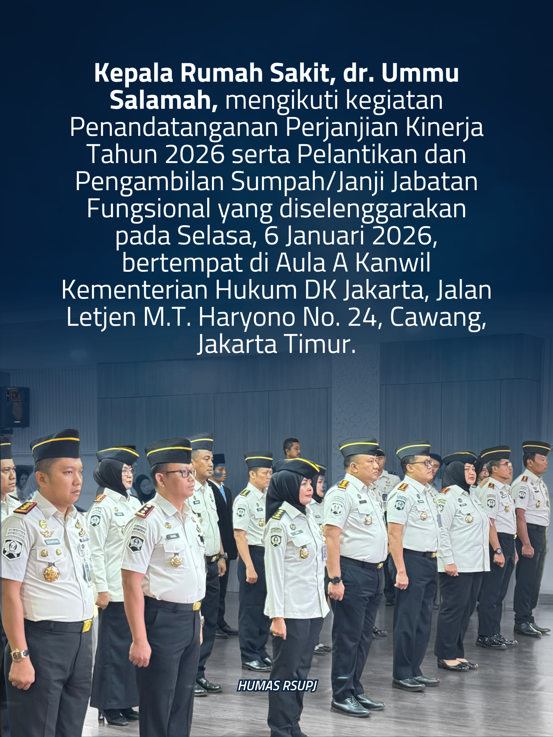 Kepala Rumah Sakit, dr. Ummu Salamah, mengikuti kegiatan Penandatanganan Perjanjian Kinerja Tahun 2026 serta Pelantikan dan Pengambilan Sumpah/Janji Jabatan Fungsional yang diselenggarakan pada Selasa, 6 Januari 2026, bertempat di Aula A Kanwil Kementerian Hukum DK Jakarta, Jalan Letjen M.T. Haryono No. 24, Cawang, Jakarta Timur.