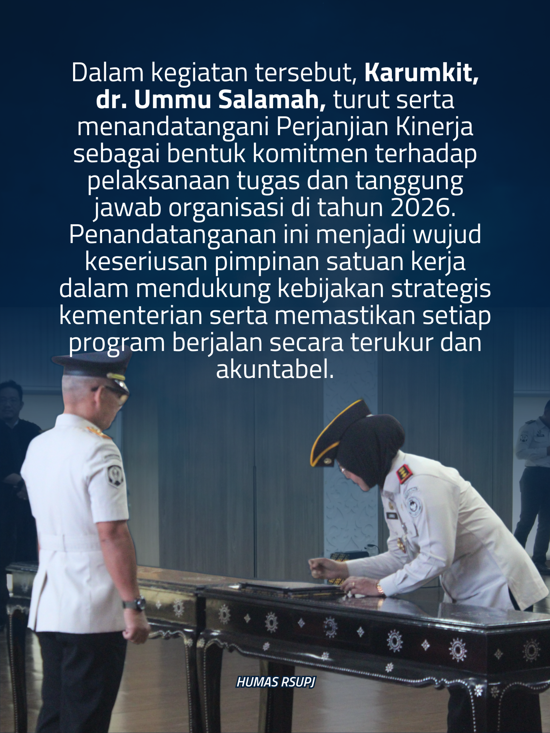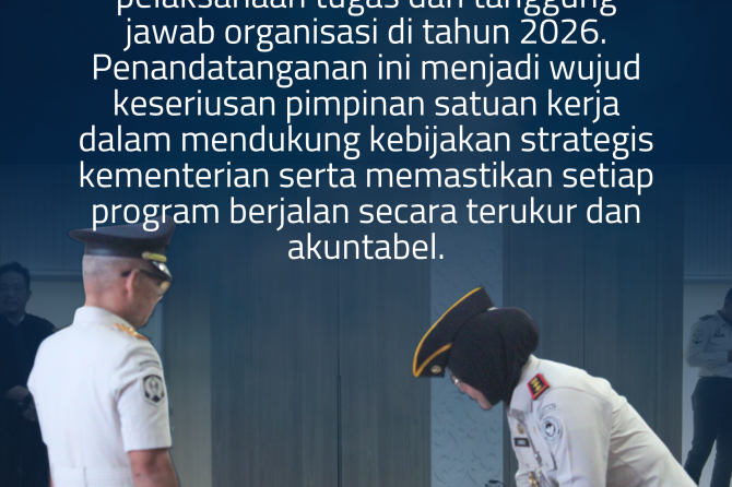 Dalam kegiatan tersebut, Karumkit, dr. Ummu Salamah, turut serta menandatangani Perjanjian Kinerja sebagai bentuk komitmen terhadap pelaksanaan tugas dan tanggung jawab organisasi di tahun 2026. Penandatanganan ini menjadi wujud keseriusan pimpinan satuan kerja dalam mendukung kebijakan strategis kementerian serta memastikan setiap program berjalan secara terukur dan akuntabel.