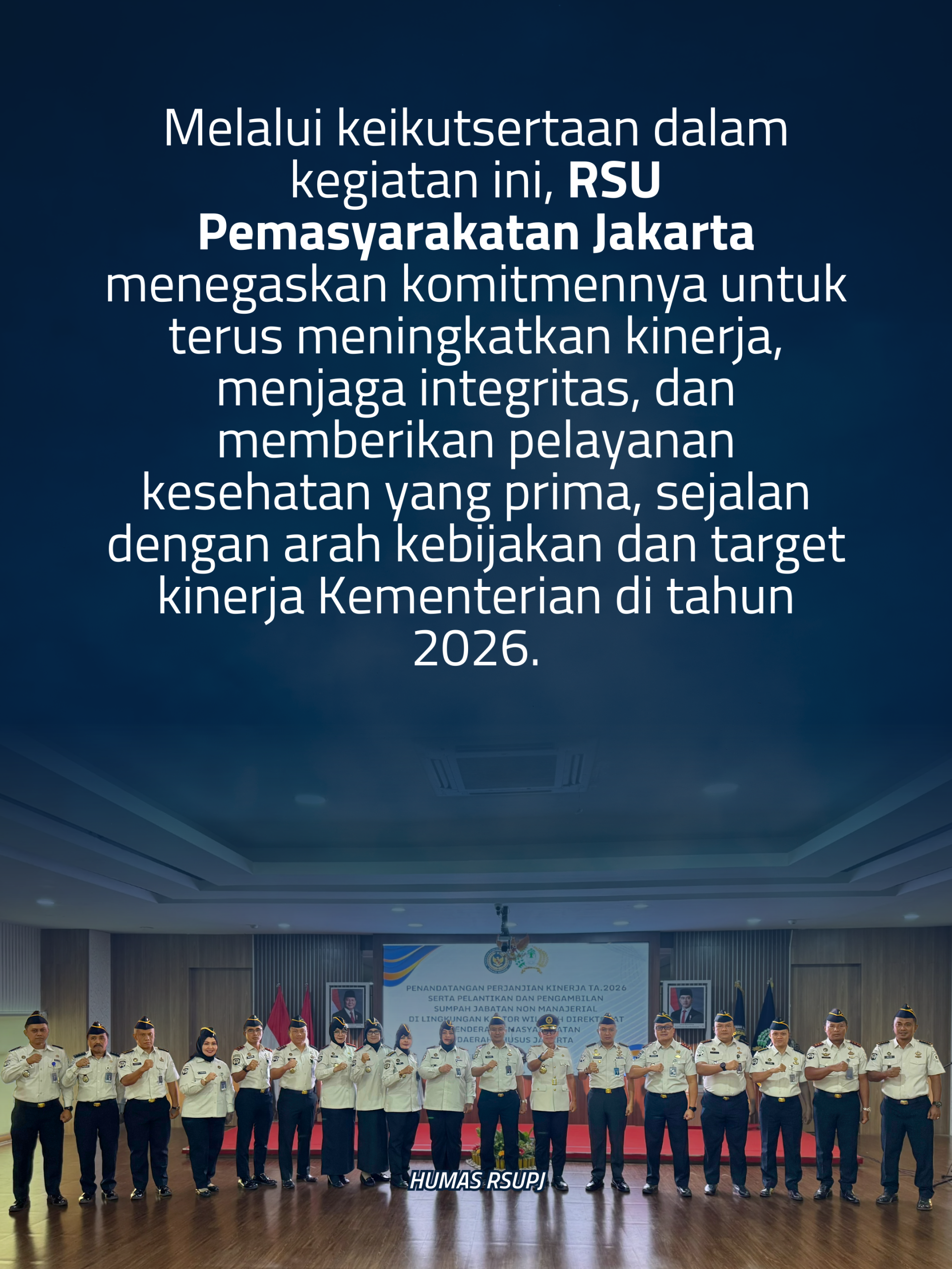 Melalui keikutsertaan dalam kegiatan ini, RSU Pemasyarakatan Jakarta menegaskan komitmennya untuk terus meningkatkan kinerja, menjaga integritas, dan memberikan pelayanan kesehatan yang prima, sejalan dengan arah kebijakan dan target kinerja Kementerian di tahun 2026.