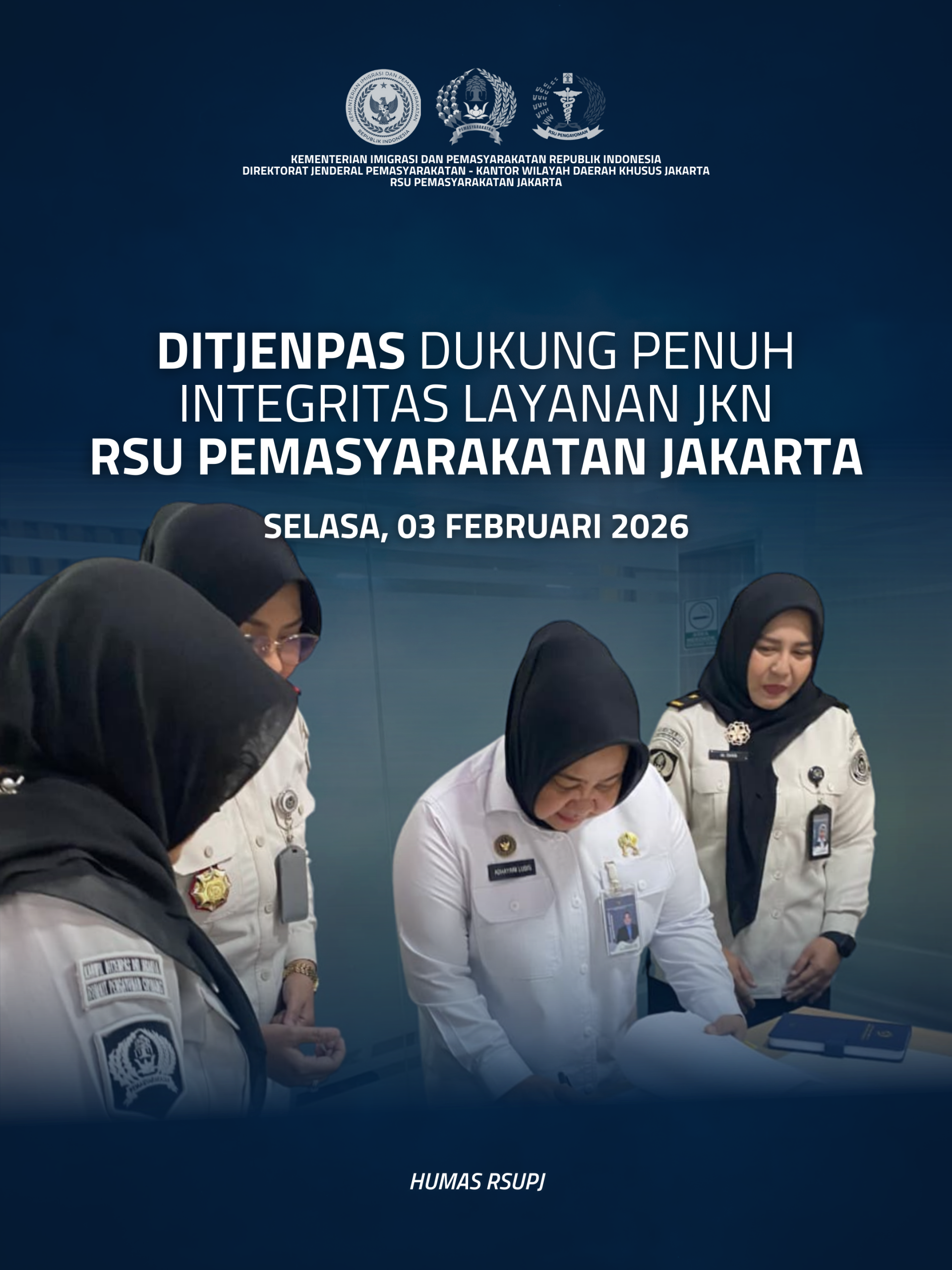 Direktorat Jenderal Pemasyarakatan melalui Direktorat Perawatan Kesehatan dan Rehabilitasi (Watkeshab) menunjukkan komitmen nyata dalam mendukung peningkatan mutu pelayanan kesehatan di RSU Pemasyarakatan Jakarta (RSUPJ). Komitmen tersebut diwujudkan melalui kegiatan Penandatanganan Komitmen/Pakta Integritas Anti Kecurangan Program Jaminan Kesehatan Nasional (JKN).