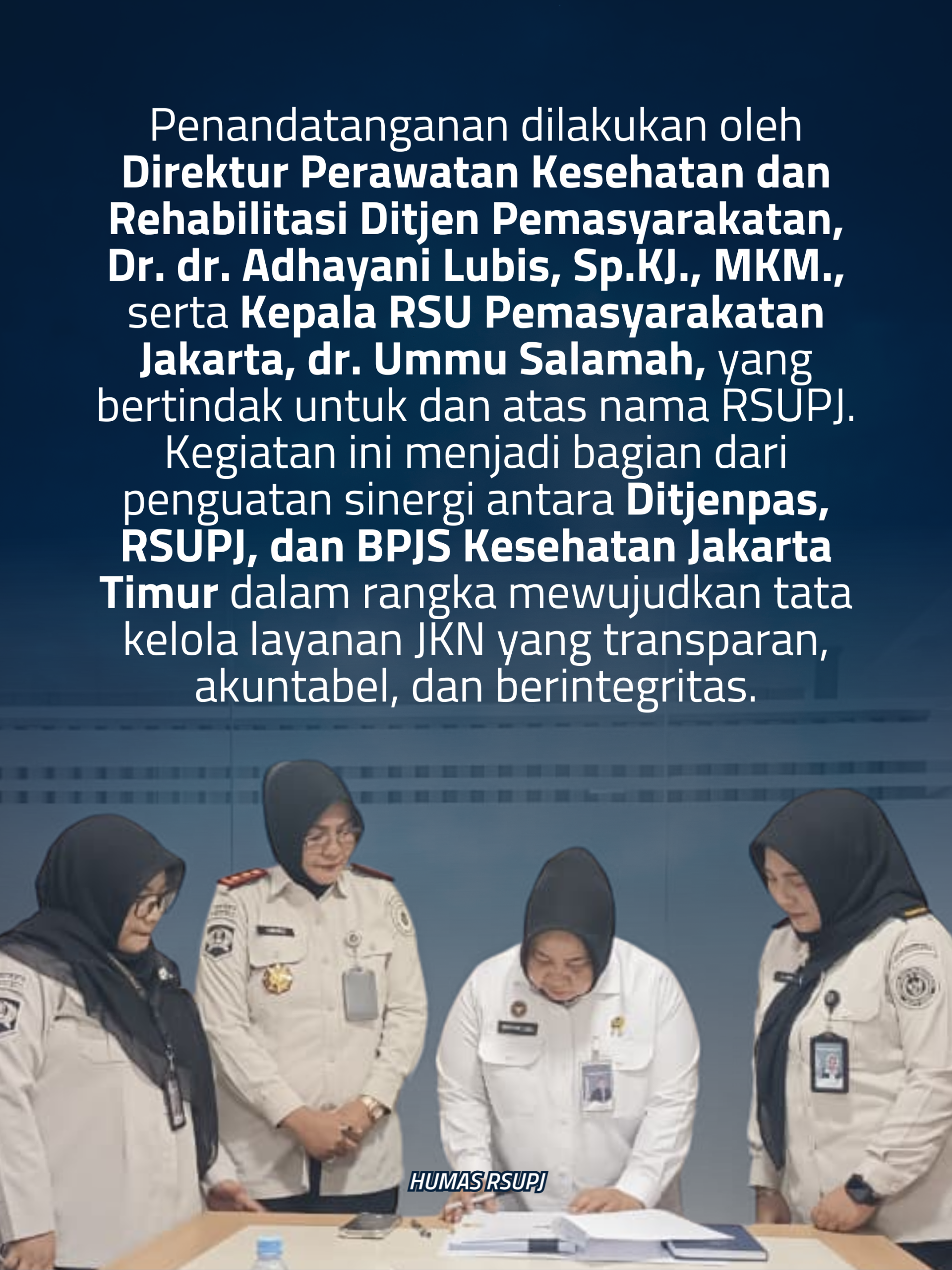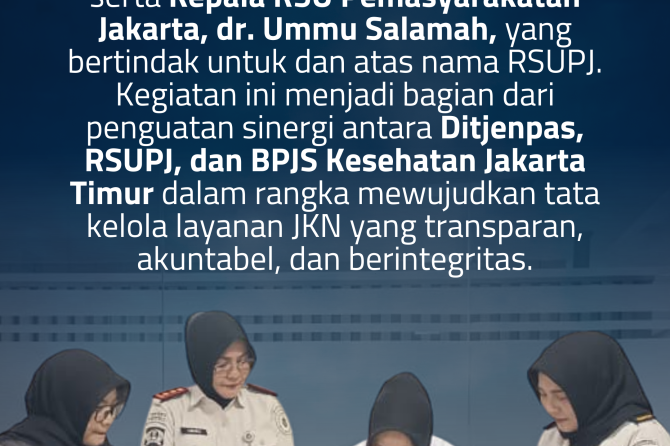 Penandatanganan dilakukan oleh Direktur Perawatan Kesehatan dan Rehabilitasi Ditjen Pemasyarakatan, Dr. dr. Adhayani Lubis, Sp.KJ., MKM., serta Kepala RSU Pemasyarakatan Jakarta, dr. Ummu Salamah, yang bertindak untuk dan atas nama RSUPJ. Kegiatan ini menjadi bagian dari penguatan sinergi antara Ditjenpas, RSUPJ, dan BPJS Kesehatan Jakarta Timur dalam rangka mewujudkan tata kelola layanan JKN yang transparan, akuntabel, dan berintegritas.