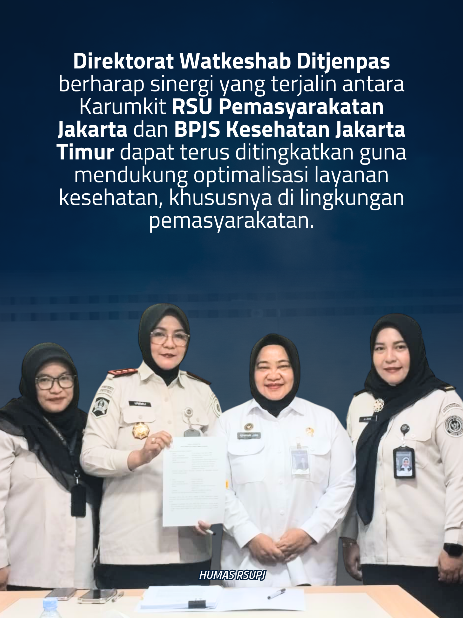 Direktorat Watkeshab Ditjenpas berharap sinergi yang terjalin antara Karumkit RSU Pemasyarakatan Jakarta dan BPJS Kesehatan Jakarta Timur dapat terus ditingkatkan guna mendukung optimalisasi layanan kesehatan, khususnya di lingkungan pemasyarakatan.