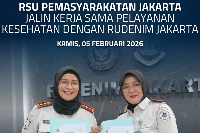 RSU Pemasyarakatan Jakarta melaksanakan penandatanganan Perjanjian Kerja Sama (PKS) dengan Rumah Detensi Imigrasi (Rudenim) Jakarta pada Kamis, 05 Februari 2026. Kegiatan ini berlangsung sebagai bentuk sinergi antarunit pelaksana teknis di lingkungan Kementerian Hukum dan Hak Asasi Manusia Republik Indonesia dalam penyelenggaraan pelayanan kesehatan.