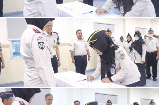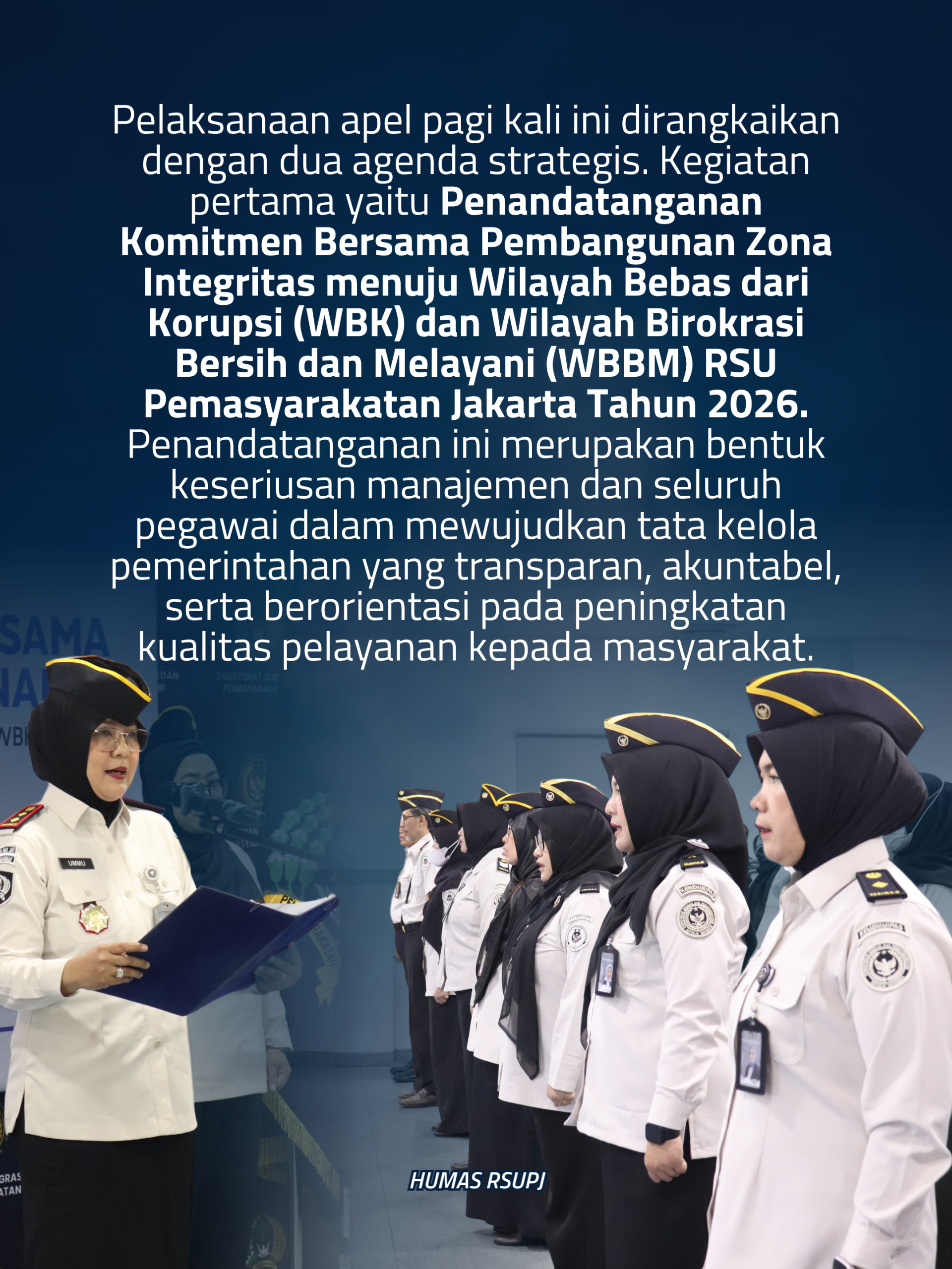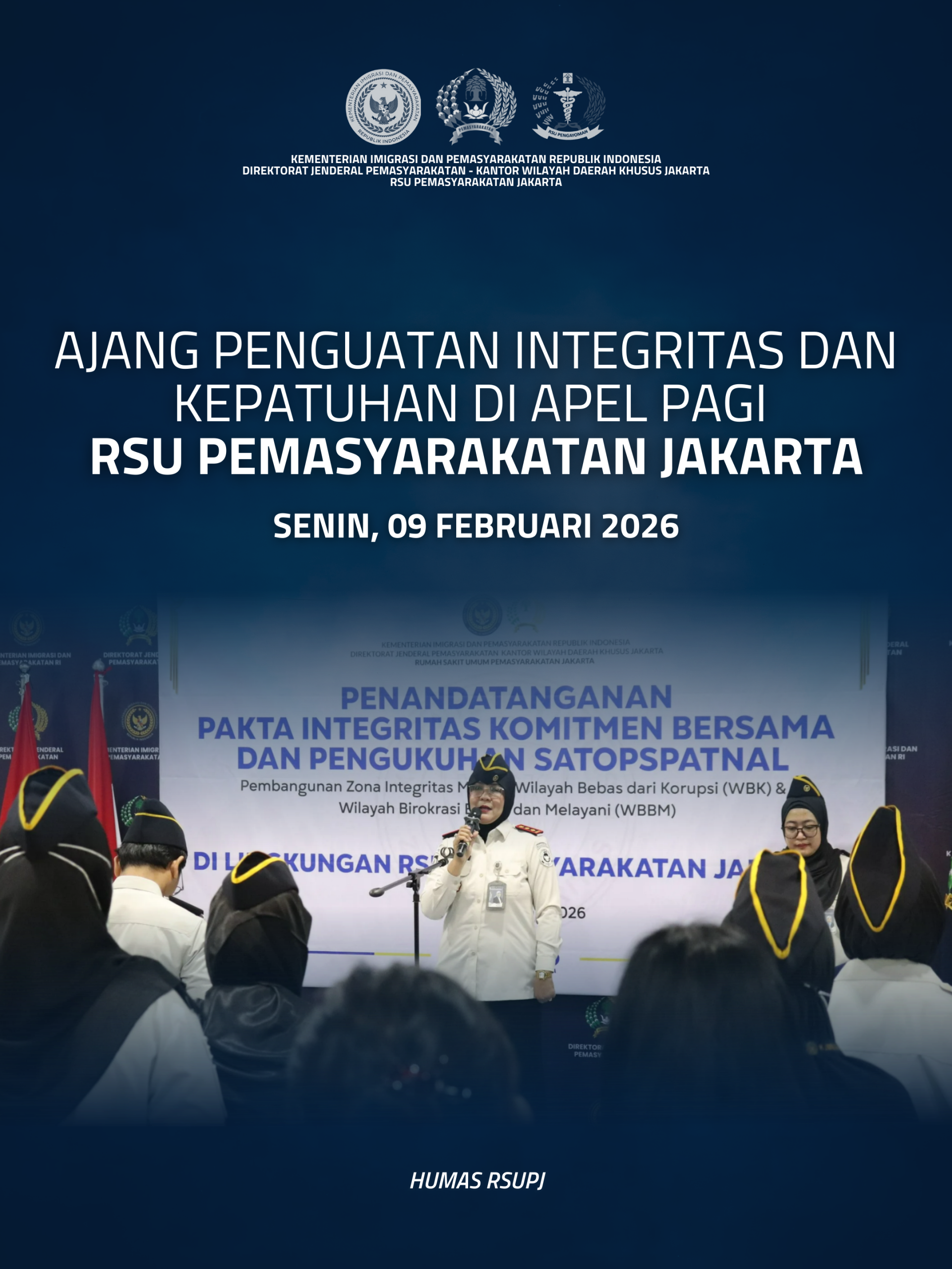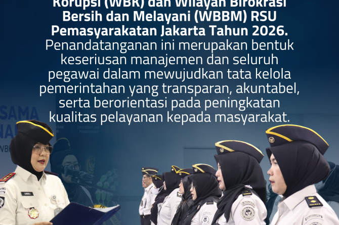 Pelaksanaan apel pagi kali ini dirangkaikan dengan dua agenda strategis. Kegiatan pertama yaitu Penandatanganan Komitmen Bersama Pembangunan Zona Integritas menuju Wilayah Bebas dari Korupsi (WBK) dan Wilayah Birokrasi Bersih dan Melayani (WBBM) RSU Pemasyarakatan Jakarta Tahun 2026. Penandatanganan ini merupakan bentuk keseriusan manajemen dan seluruh pegawai dalam mewujudkan tata kelola pemerintahan yang transparan, akuntabel, serta berorientasi pada peningkatan kualitas pelayanan kepada masyarakat.
