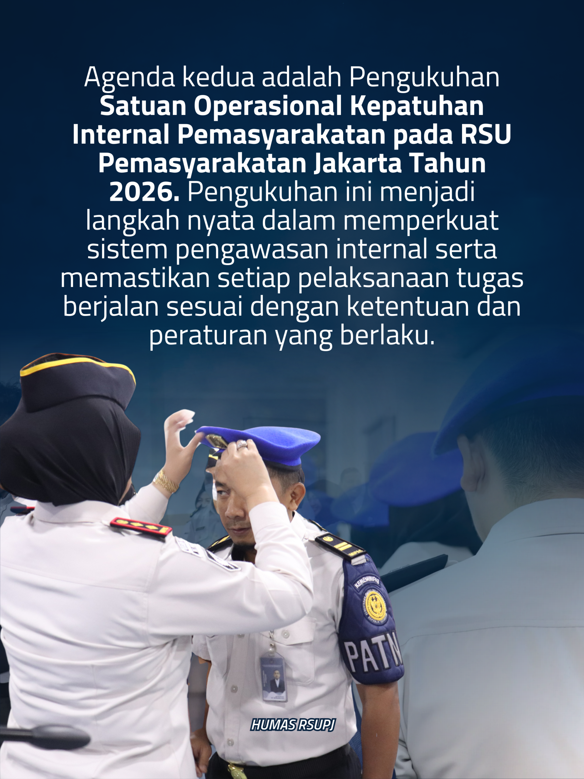 Agenda kedua adalah Pengukuhan Satuan Operasional Kepatuhan Internal Pemasyarakatan pada RSU Pemasyarakatan Jakarta Tahun 2026. Pengukuhan ini menjadi langkah nyata dalam memperkuat sistem pengawasan internal serta memastikan setiap pelaksanaan tugas berjalan sesuai dengan ketentuan dan peraturan yang berlaku.