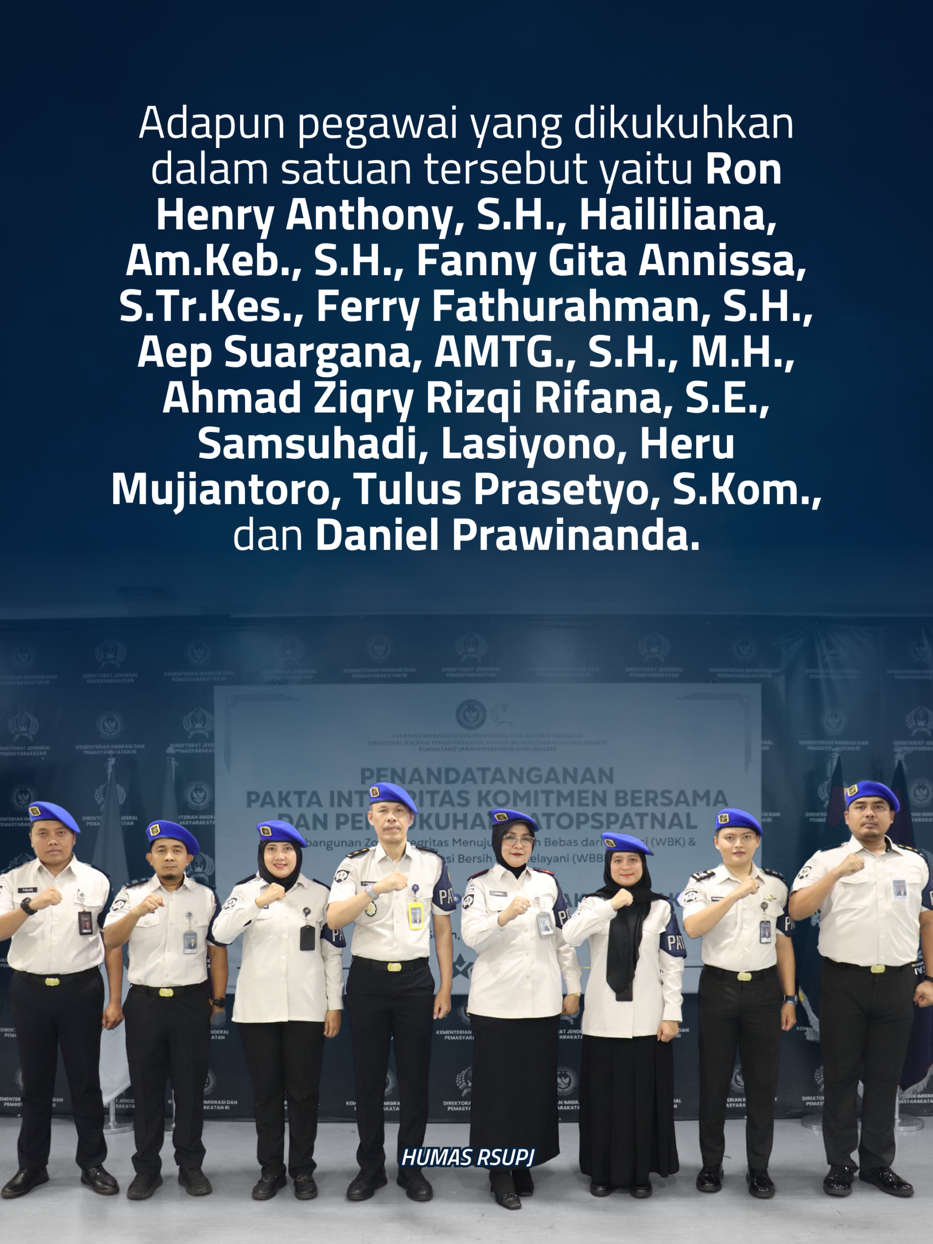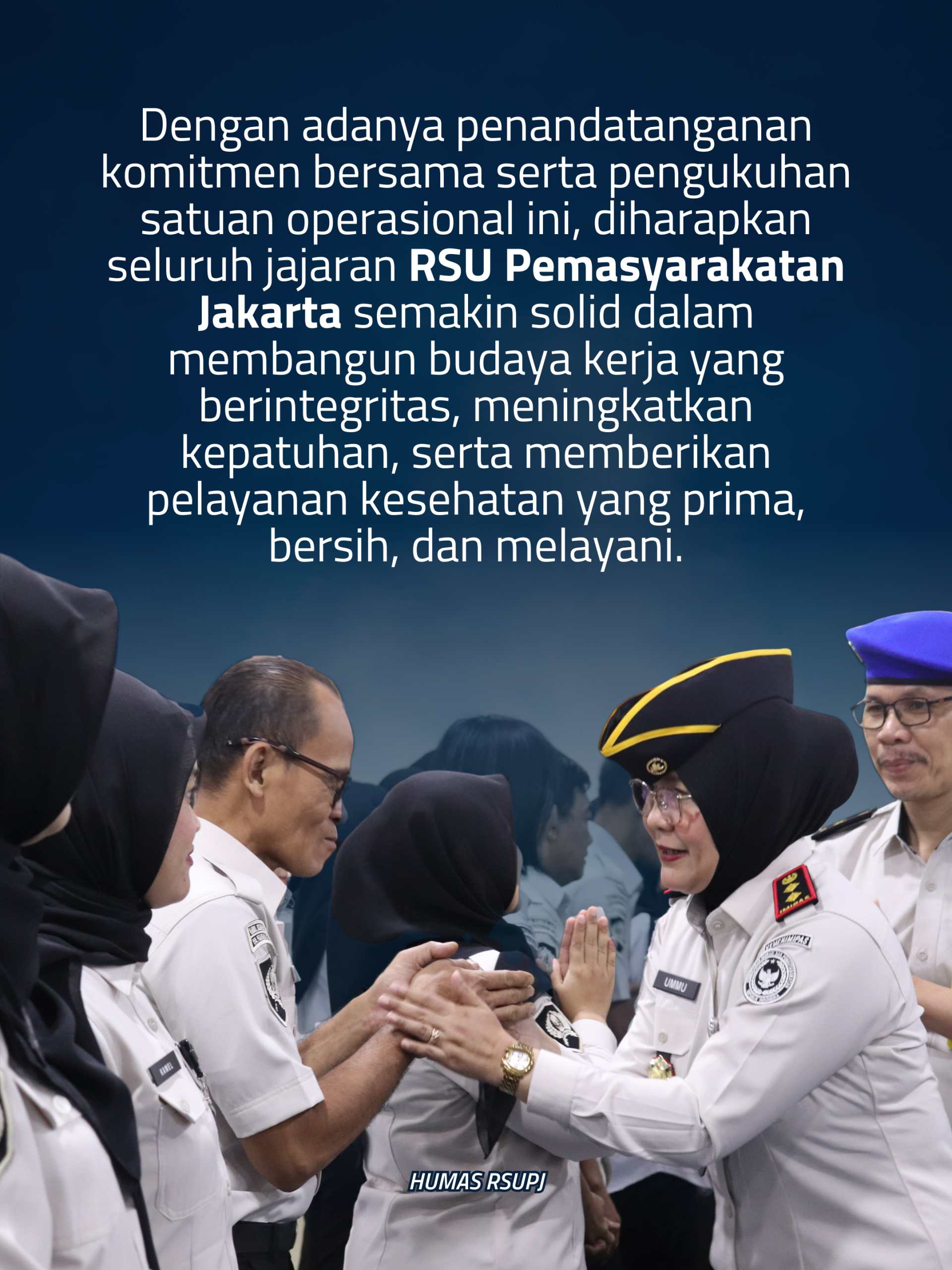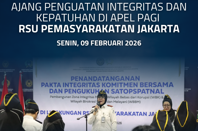 Dengan adanya penandatanganan komitmen bersama serta pengukuhan satuan operasional ini, diharapkan seluruh jajaran RSU Pemasyarakatan Jakarta semakin solid dalam membangun budaya kerja yang berintegritas, meningkatkan kepatuhan, serta memberikan pelayanan kesehatan yang prima, bersih, dan melayani.
