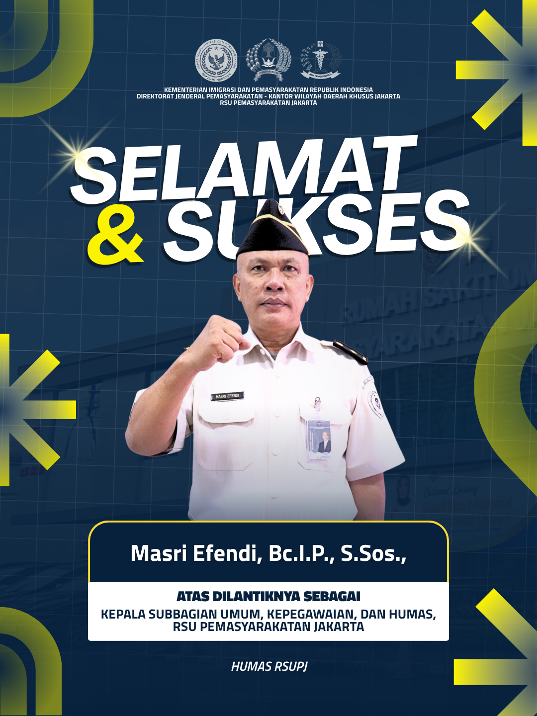 Selamat dan sukses atas dilantiknya Masri Efendi, Bc.I.P., S.Sos. sebagai Kepala Subbagian Umum, Kepegawaian, dan Humas RSU Pemasyarakatan Jakarta.
