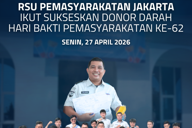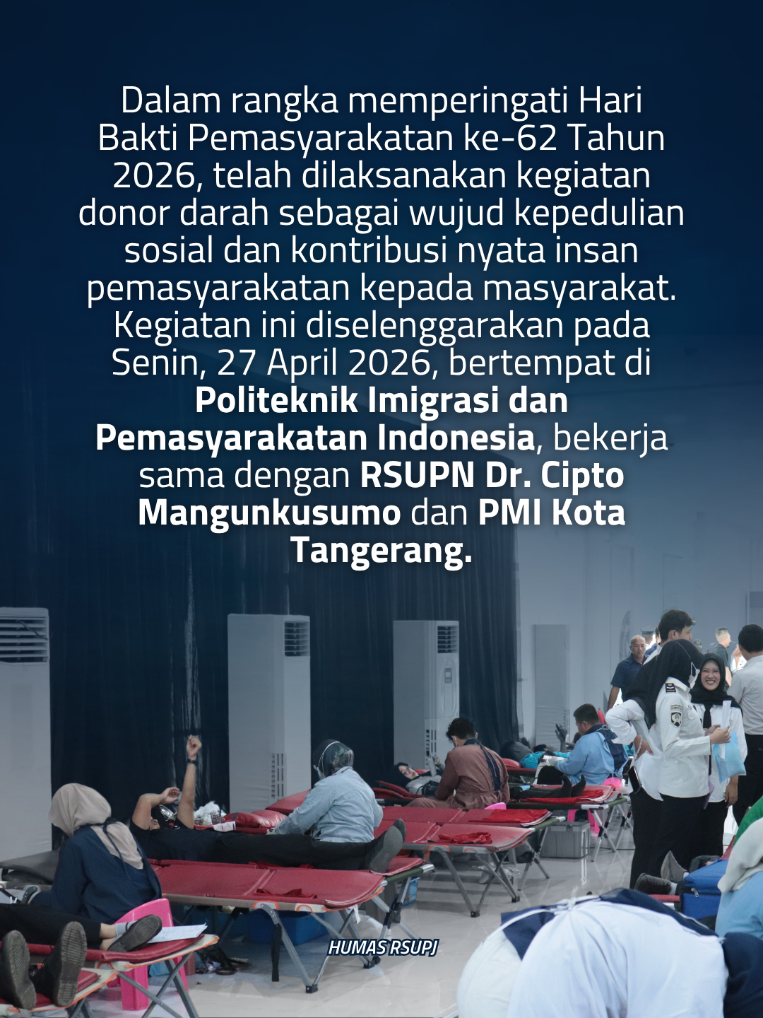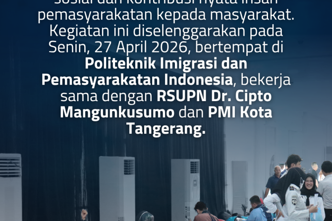 Dalam rangka memperingati Hari Bakti Pemasyarakatan ke-62 Tahun 2026, telah dilaksanakan kegiatan donor darah sebagai wujud kepedulian sosial dan kontribusi nyata insan pemasyarakatan kepada masyarakat. Kegiatan ini diselenggarakan pada Senin, 27 April 2026, bertempat di Politeknik Imigrasi dan Pemasyarakatan Indonesia, bekerja sama dengan RSUPN Dr. Cipto Mangunkusumo dan PMI Kota Tangerang.